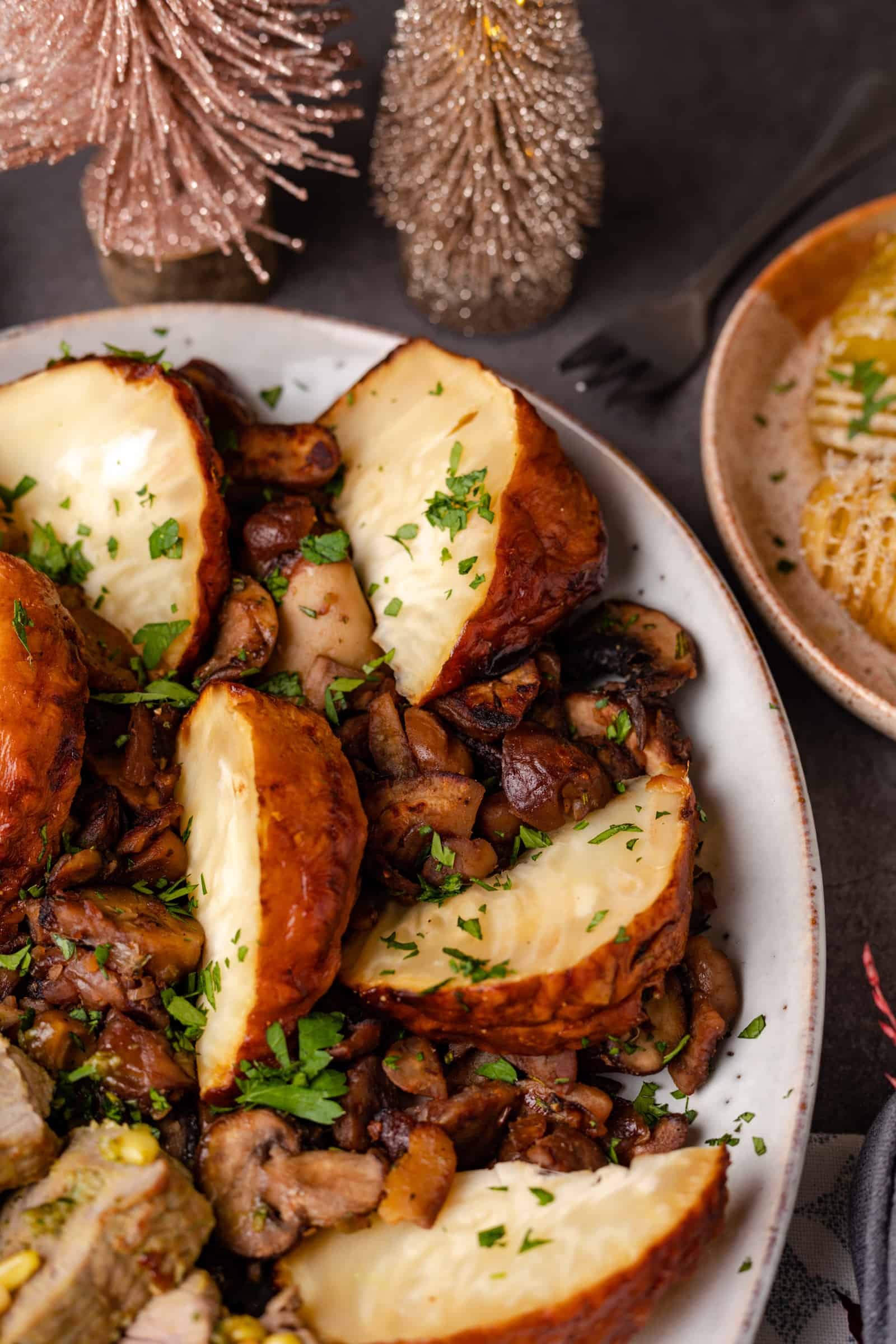 Wat een feest voor de smaakpapillen is deze geroosterde knolselderij met kastanjes en champignons. Die je als bijgerecht bij de rollade kunt serveren, maar die op zichzelf ook geweldig is als vega hoofdgerecht.