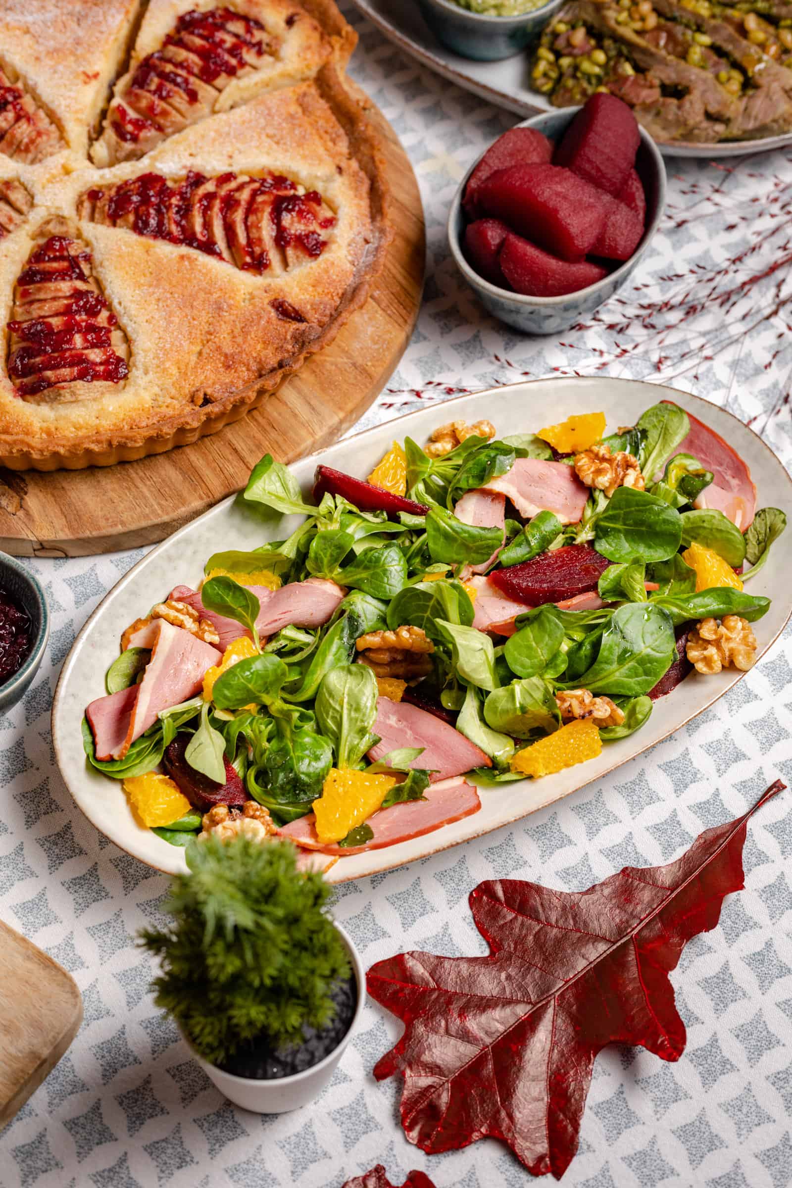 Voor deze prachtige salade gebruikte ik deze gerookte eendenborst en die combineerde ik met veldsla, sinaasappel, biet, walnoten en een sojadressing. Het snijden van de partjes sinaasappel en biet, het roosteren van de walnoten en het maken van de dressing kun je voorbereiden en vast klaarzetten. Het samenstellen van de salade doe je op het laatste moment en dat kost je nog geen 5 minuten.