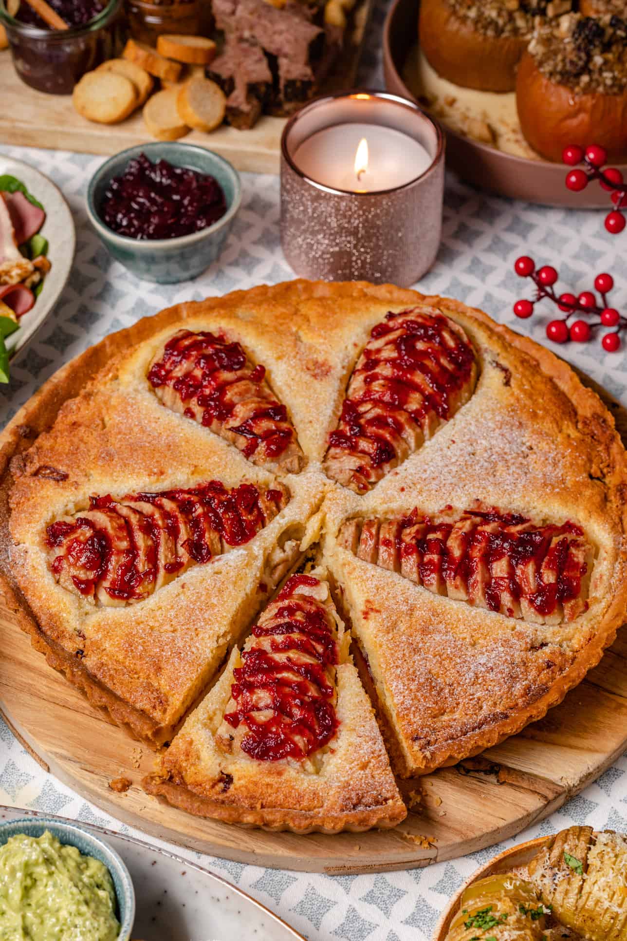 Het spektakelstuk van dit brunch kerstmenu is toch wel deze perentaart met cranberry en frangipane. Deze taart maak je helemaal zelf, van bodem tot vulling, en is een feest om te eten. Je kunt ‘m al prima een dag eerder maken en afgedekt bewaren.