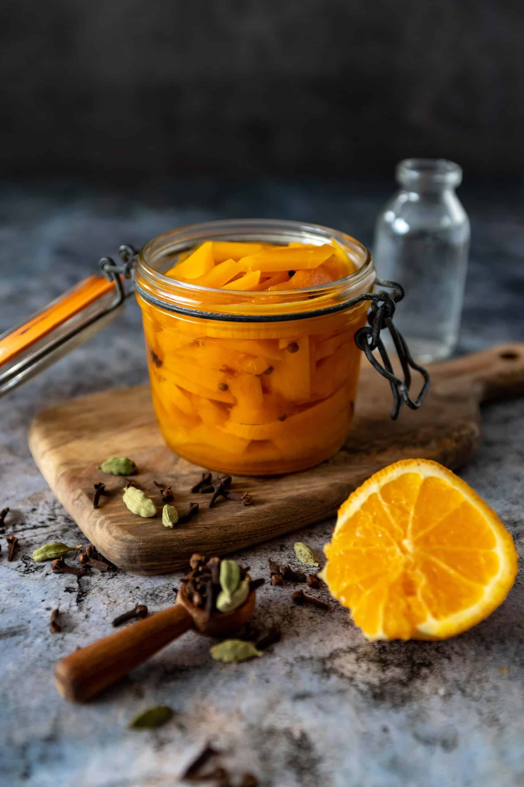 Deze zoetzure pompoen smaakt bijna als kleine groentesnoepjes. Je kunt deze nu al maken en bewaren in een goed afgesloten weckpot in de koelkast. Zo kan de smaak alleen maar beter ontwikkelen.