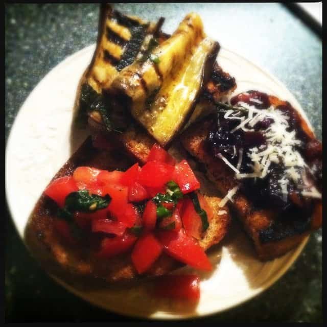 3 soorten bruschetta’s met aubergine, rode ui en tomaat