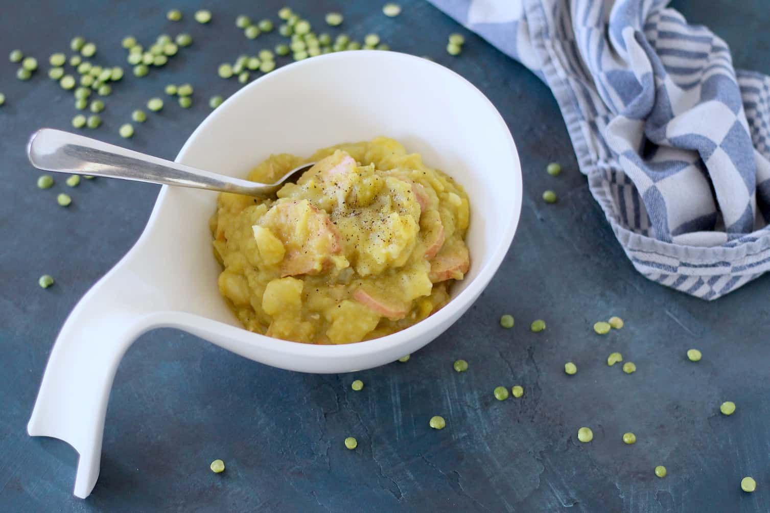 Het is vooral de geur van erwtensoep waar ik zo van hou, vanaf het moment dat je de pan op het vuur hebt staan pruttelen met de spliterwten. Alleen al door die geur kan ik de soep al bijna proeven. Dat proeven doe ik met een lepel waarvan ik hoop dat deze rechtop blijft staan in mijn kom, want het liefst heb ik mijn erwtensoep lekker dik. Ook als deze vegetarisch is. Eigenlijk is een vegetarische erwtensoep heel makkelijk om te maken. Je hebt er alleen wat tijd voor nodig, zoals altijd bij erwtensoep. Maak ‘m daarom de avond ervoor vast, dan kun je de volgende dag snel aan tafel.