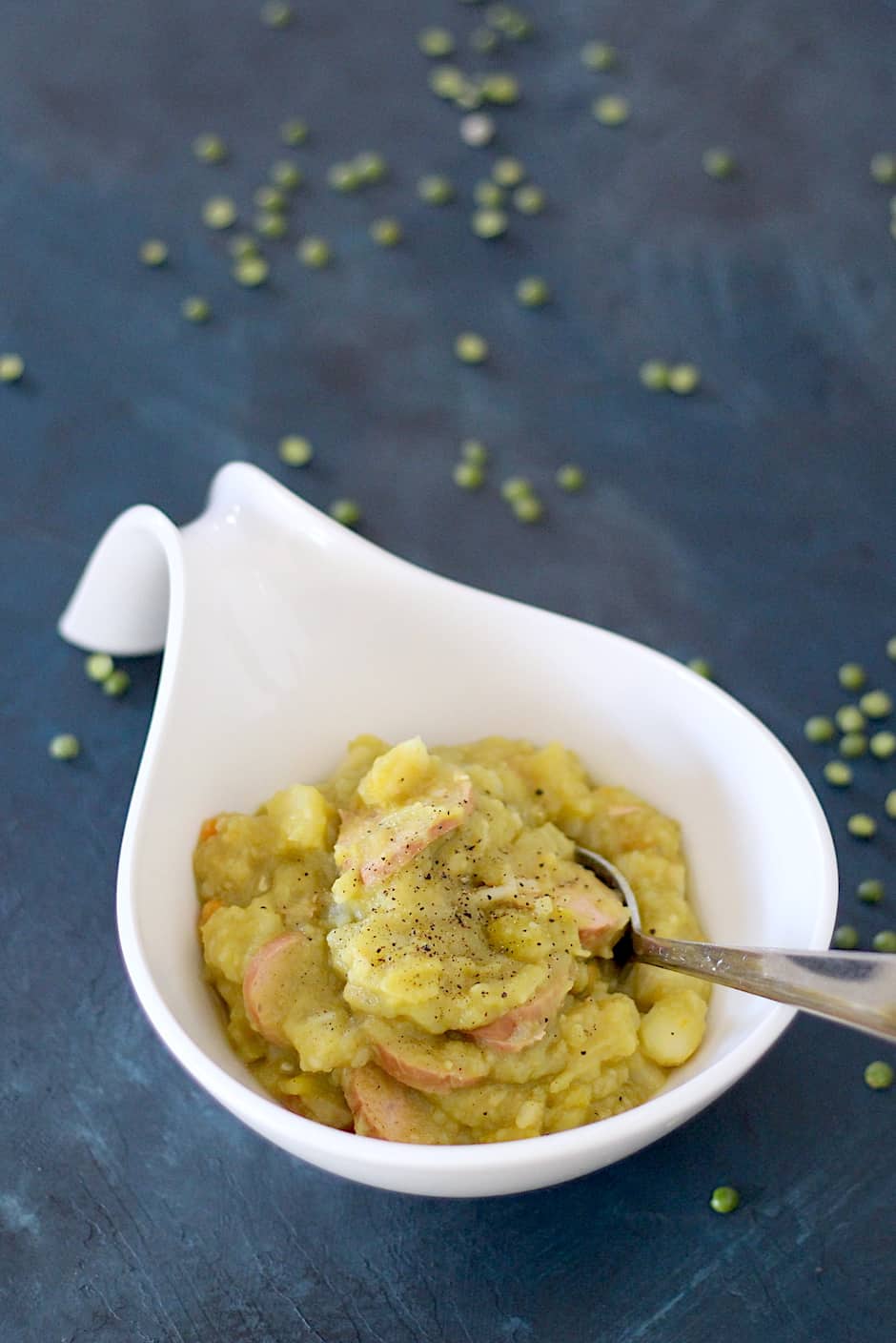 Het is vooral de geur van erwtensoep waar ik zo van hou, vanaf het moment dat je de pan op het vuur hebt staan pruttelen met de spliterwten. Alleen al door die geur kan ik de soep al bijna proeven. Dat proeven doe ik met een lepel waarvan ik hoop dat deze rechtop blijft staan in mijn kom, want het liefst heb ik mijn erwtensoep lekker dik. Ook als deze vegetarisch is. Eigenlijk is een vegetarische erwtensoep heel makkelijk om te maken. Je hebt er alleen wat tijd voor nodig, zoals altijd bij erwtensoep. Maak ‘m daarom de avond ervoor vast, dan kun je de volgende dag snel aan tafel.
