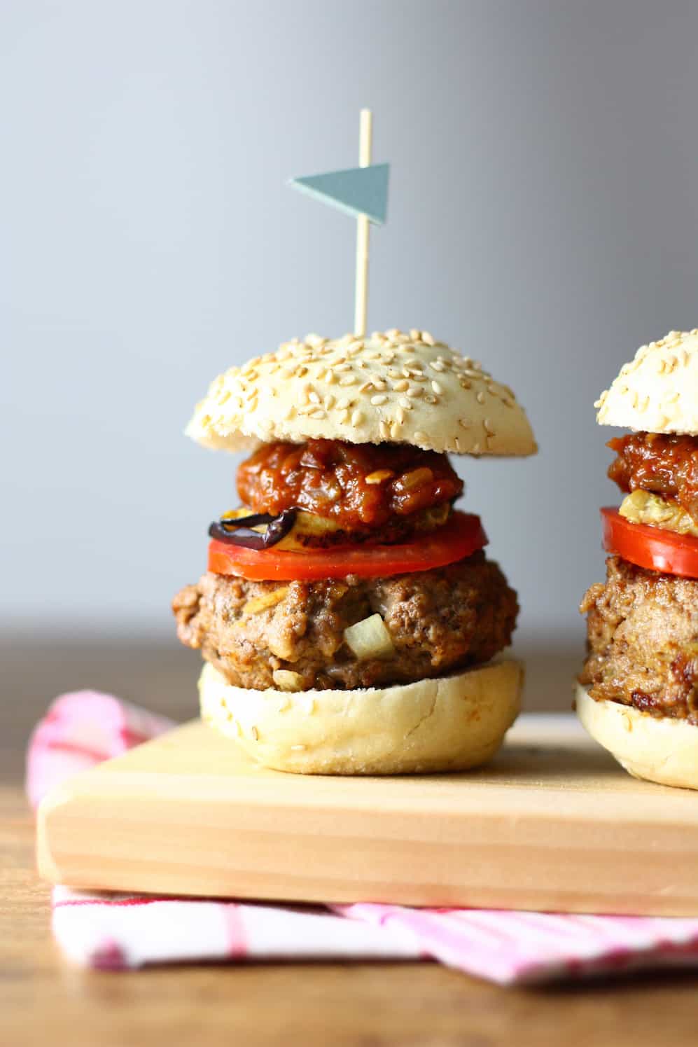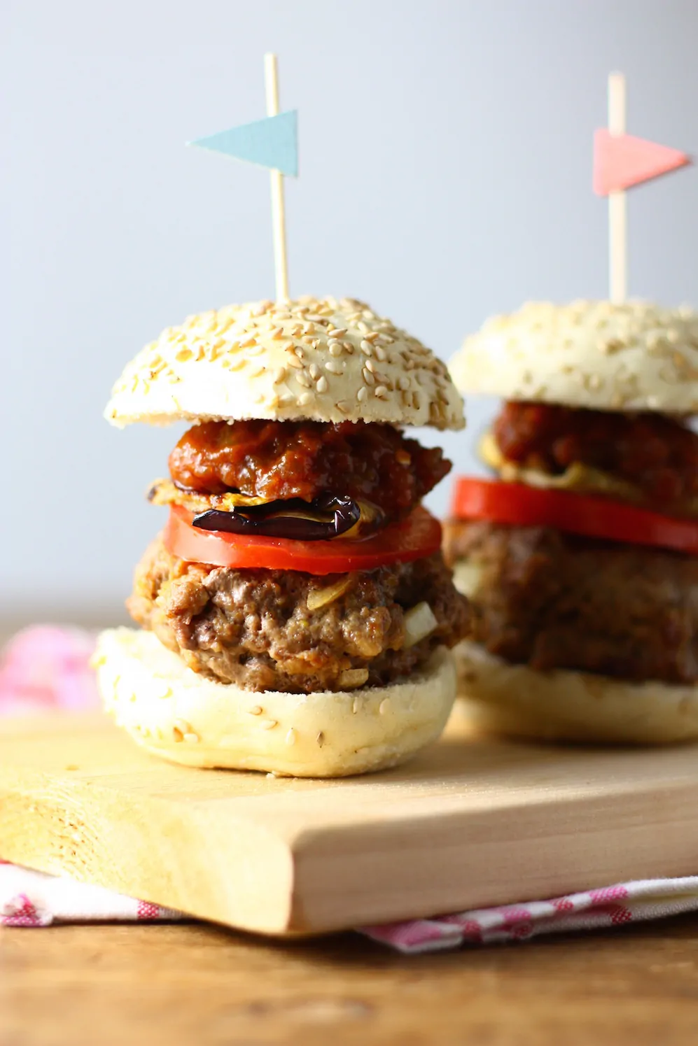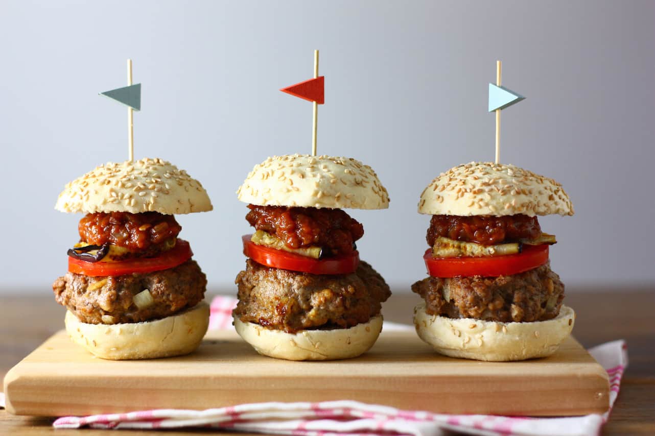 Deze mini burgers met gegrilde aubergine zijn ondanks het formaat toch een groot feest. En helemaal niet ingewikkeld om te maken, zeker als je de kant-en-klare mouhamara van MezMez gebruikt als topping. Dit is een pittige mazza op basis van tomaten, gebakken uitjes, sambal, granaatappelsiroop en walnoot. Heerlijk van smaak en zonder onnodige toevoegingen, ook super als een dip. Maar je kunt ‘m ook zelf maken, daarvoor heb ik hier op de site een recept staan.