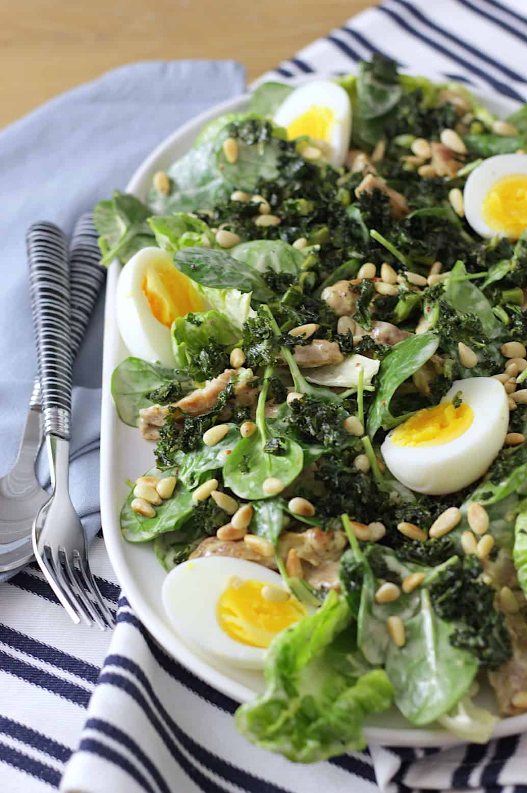 6. Meng de spruitjes (of groene asperges), blaadjes romaine sla, spinazie en reepjes kip met een deel van de dressing in een grote kom. Verdeel over een grote schaal of 4 borden en maak af met de krokante boerenkool (of broccoli), eieren, dressing, pijnboompitten en dien op.
