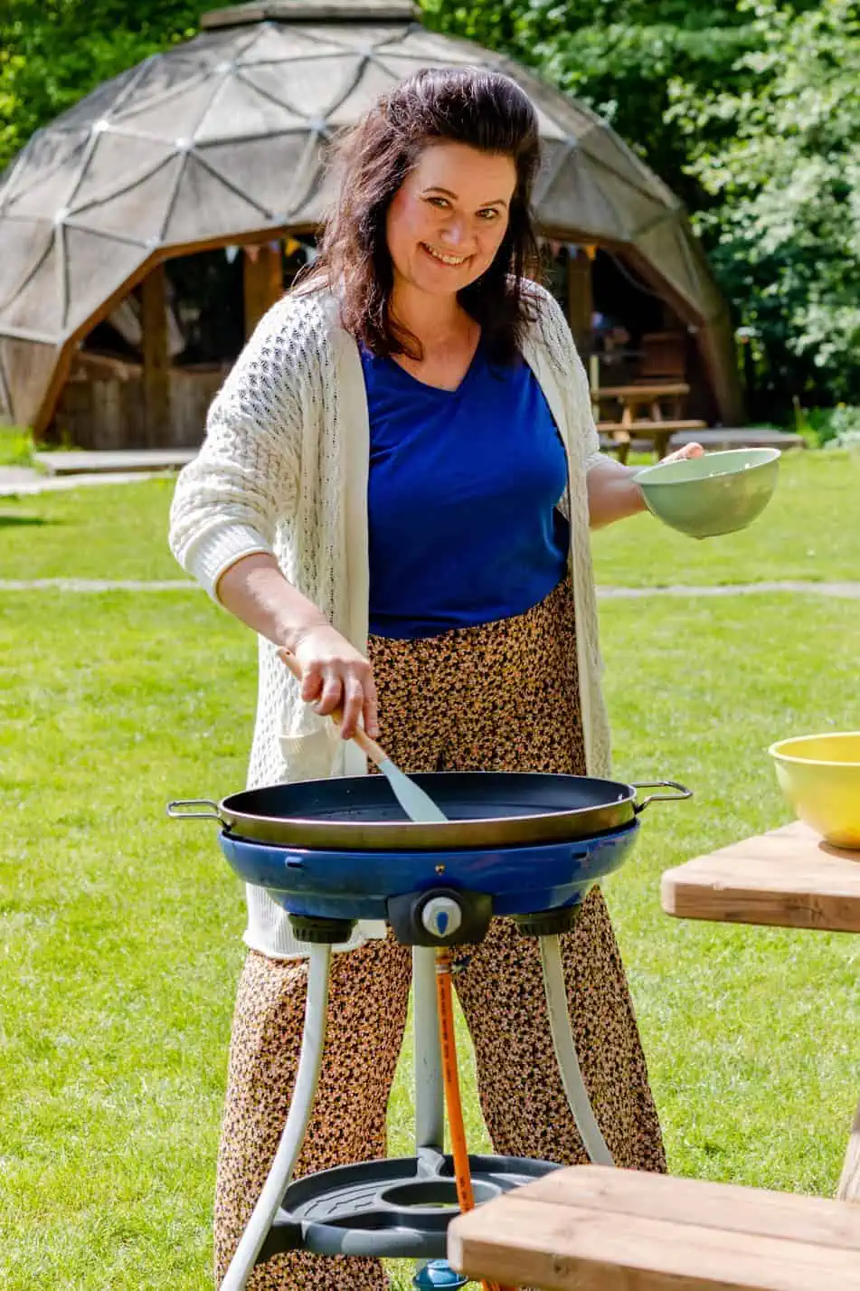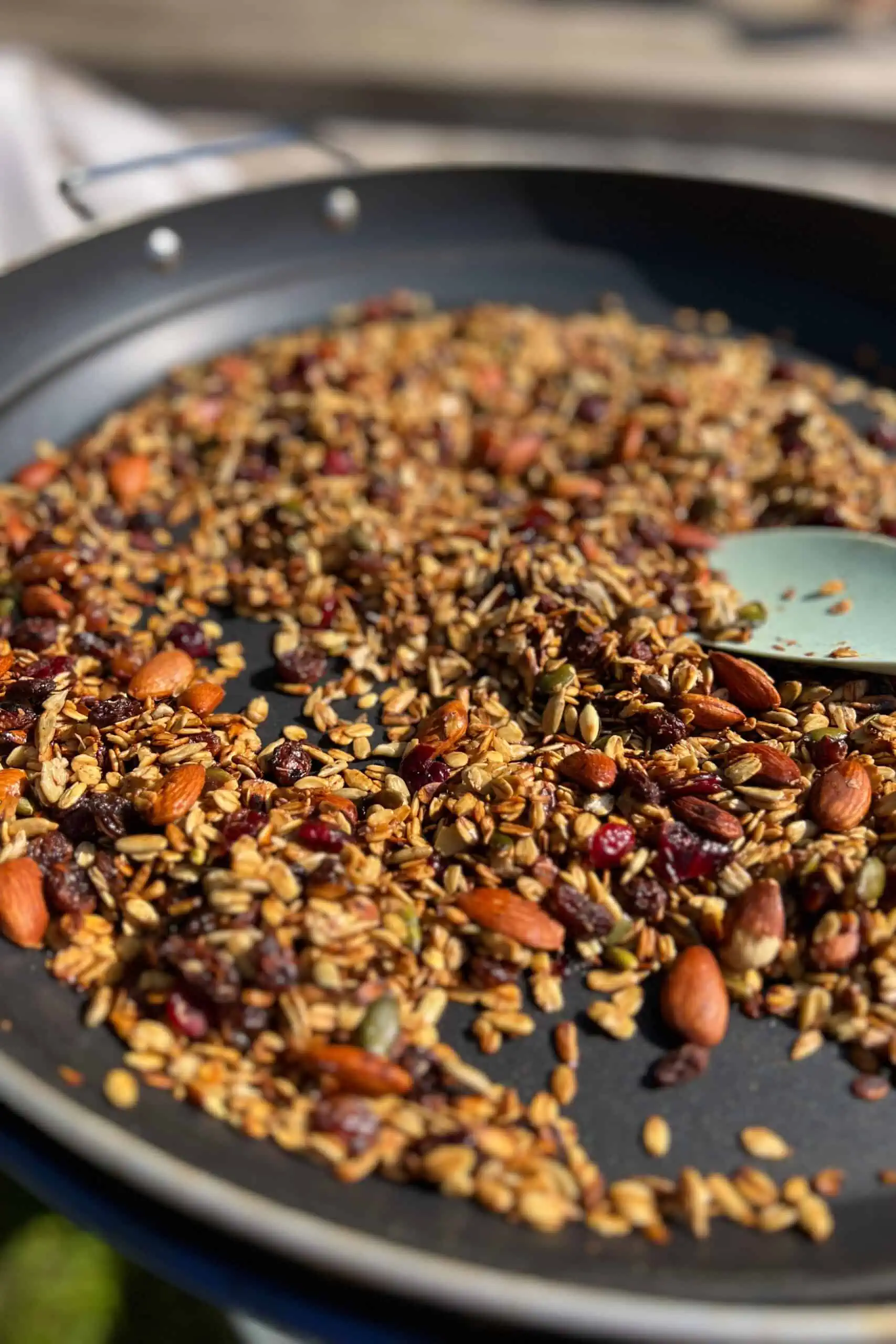 Wellicht denk je dat je granola alleen in de oven kunt maken, maar niets is minder waar. Granola uit de pan werkt namelijk ook heel goed. En als jij voor de camping ook zo’n fijne skottelbraai hebt dan heb je binnen 10 minuten ook je camping granola klaar voor het ontbijt. Ik ben echt groot fan van de Cadac barbecues voor op de camping. Deze granola maakte ik op een skottelbraai van vrienden van ons die al jaren meegaat. Mij maak je echt helemaal blij met de enorme paellpan die erbij zit. Daarin kun je namelijk ontzettend veel bereiden, waaronder deze granola.