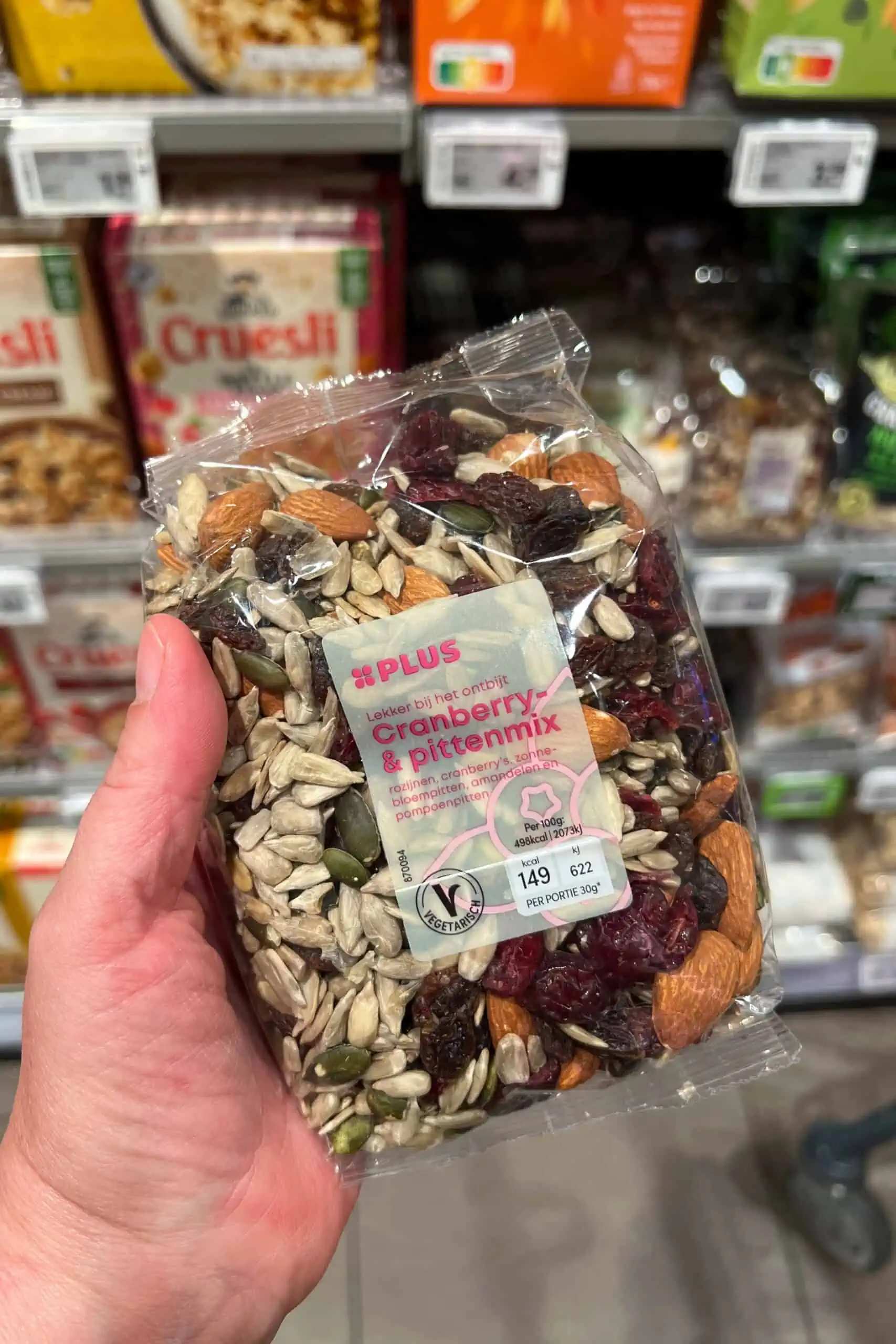 Je hebt er maar een paar ingrediënten voor nodig: plantaardige olie, grove havervlokken, kaneel, honing (of ahornsiroop) en een zakje pittenmix. Een perfecte hack voor op de camping zijn deze zakjes die ik bij PLUS vond. Onbewerkte pitten en zaden die gecombineerd zijn met rozijnen of in dit geval cranberry’s. Stop het in je boodschappenkrat en je bent klaar voor het ontbijt.