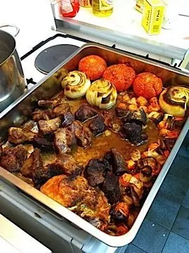 ·      In a big baking tray, put the meat and the vegetables (give them space). Sprinkle with olive oil. Add salt, pepper, cinnamon, nutmeg and bay. Bake it 45 minutes at 200 degrees.