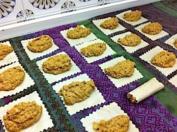 ·      When the pasta is ready, place the pasta on a big table, put the filling on the pasta and make canelon rolls. Put the canelons in a baking tray.