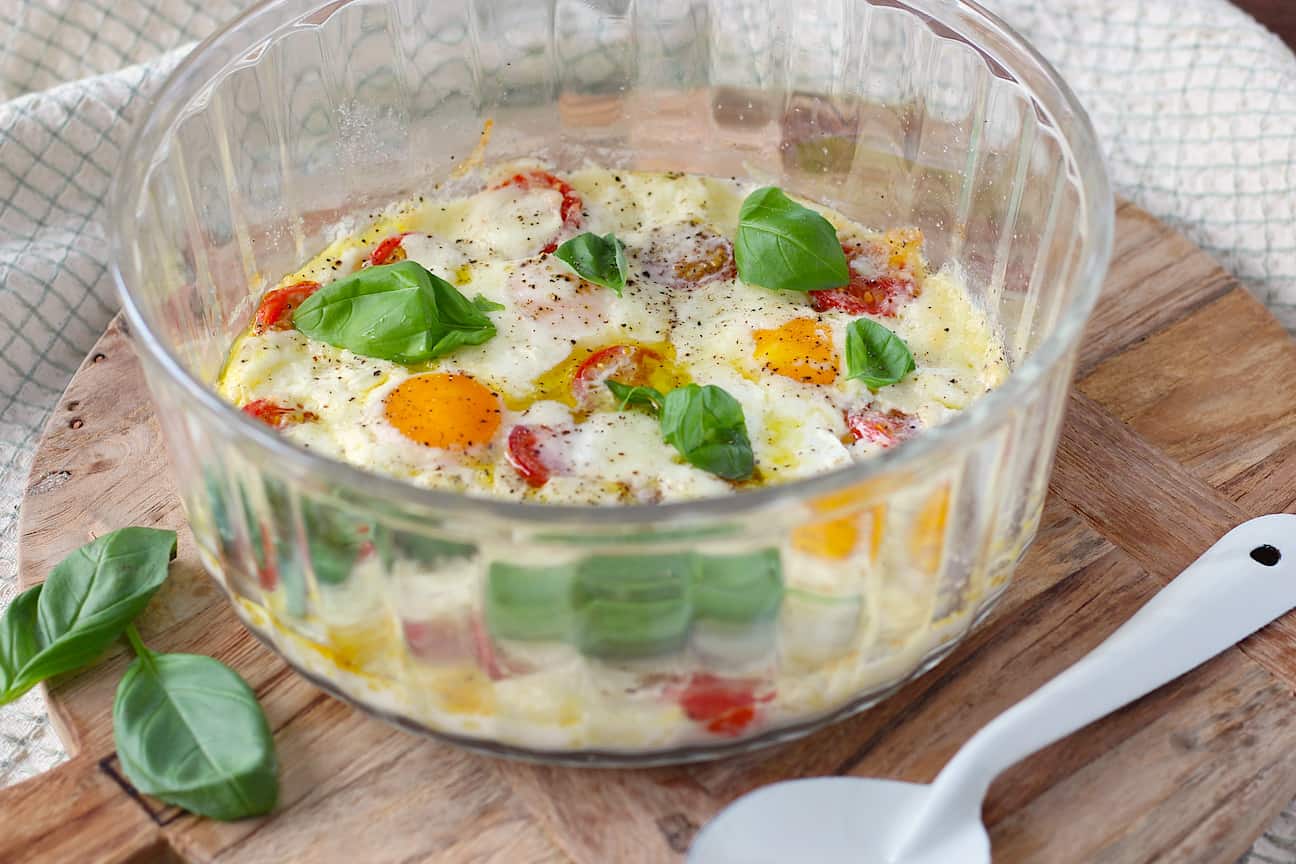 2. Neem een ronde ovenschaal en breek hier voorzichtig de eitjes in. Probeer de dooier heel te houden. Lukt dat niet dan is dat geen enkel probleem, het ziet er alleen net wat mooier uit. Snijd de cherry tomaten in tweeën en verdeel die over de eieren. Scheur de bol mozzarella in stukjes en verdeel die er ook over. Scheur de helft van de basilicumblaadjes en strooi die over de mozzarella. Bestrooi met peper en zout en besprenkel met olijfolie.