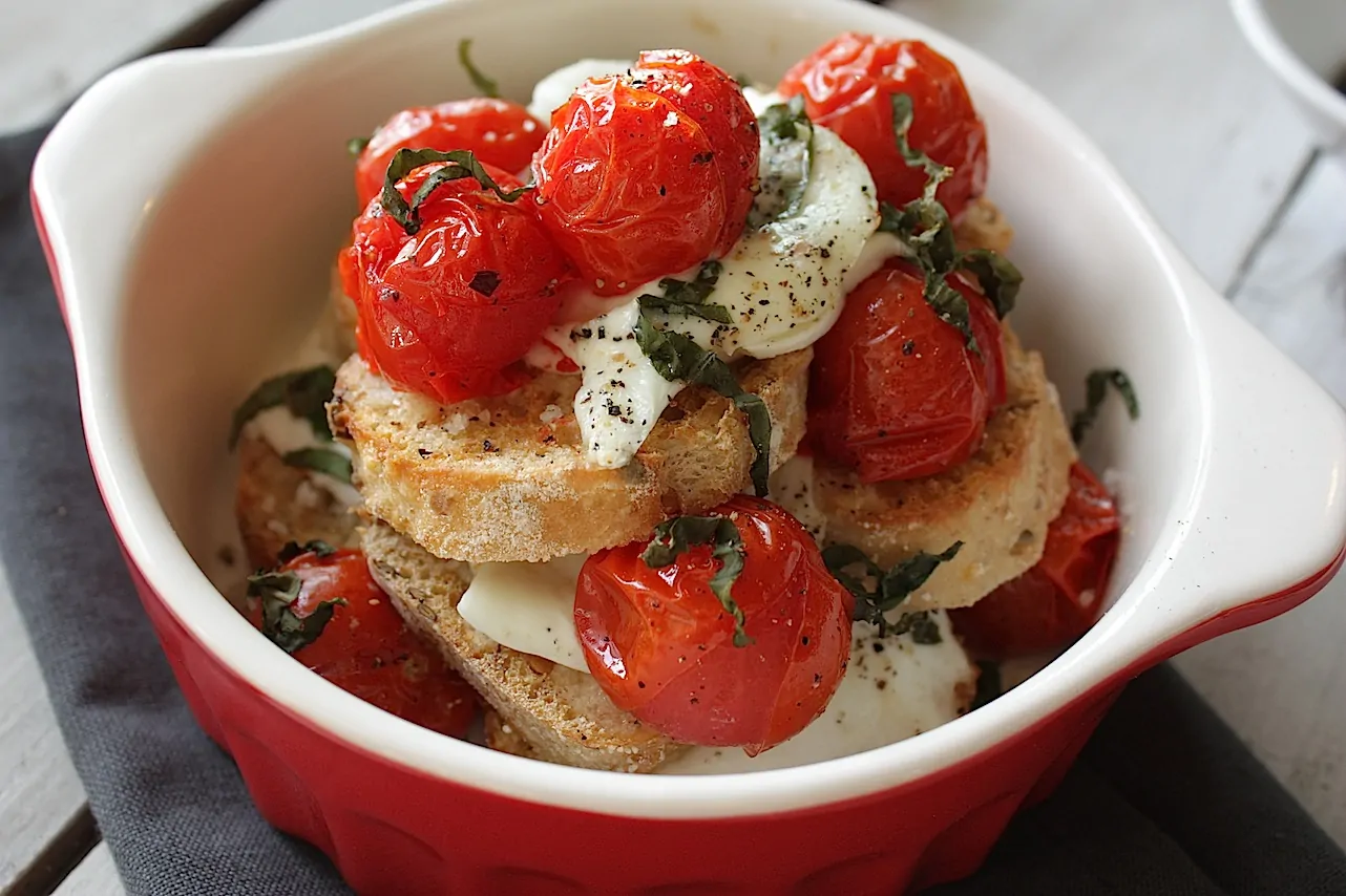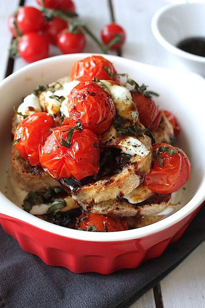 Zet het ovenschaaltje (voorzichtig, want je wilt niet dat je heerlijke caprese berg instort) 5 minuten in de oven zodat de mozzarella net gesmolten is. Besprenkel met de balsamicostroop naar smaak, serveer direct en eet het alsof je een schaaltje nachos met kaas hebt gekregen. En geniet, big time!