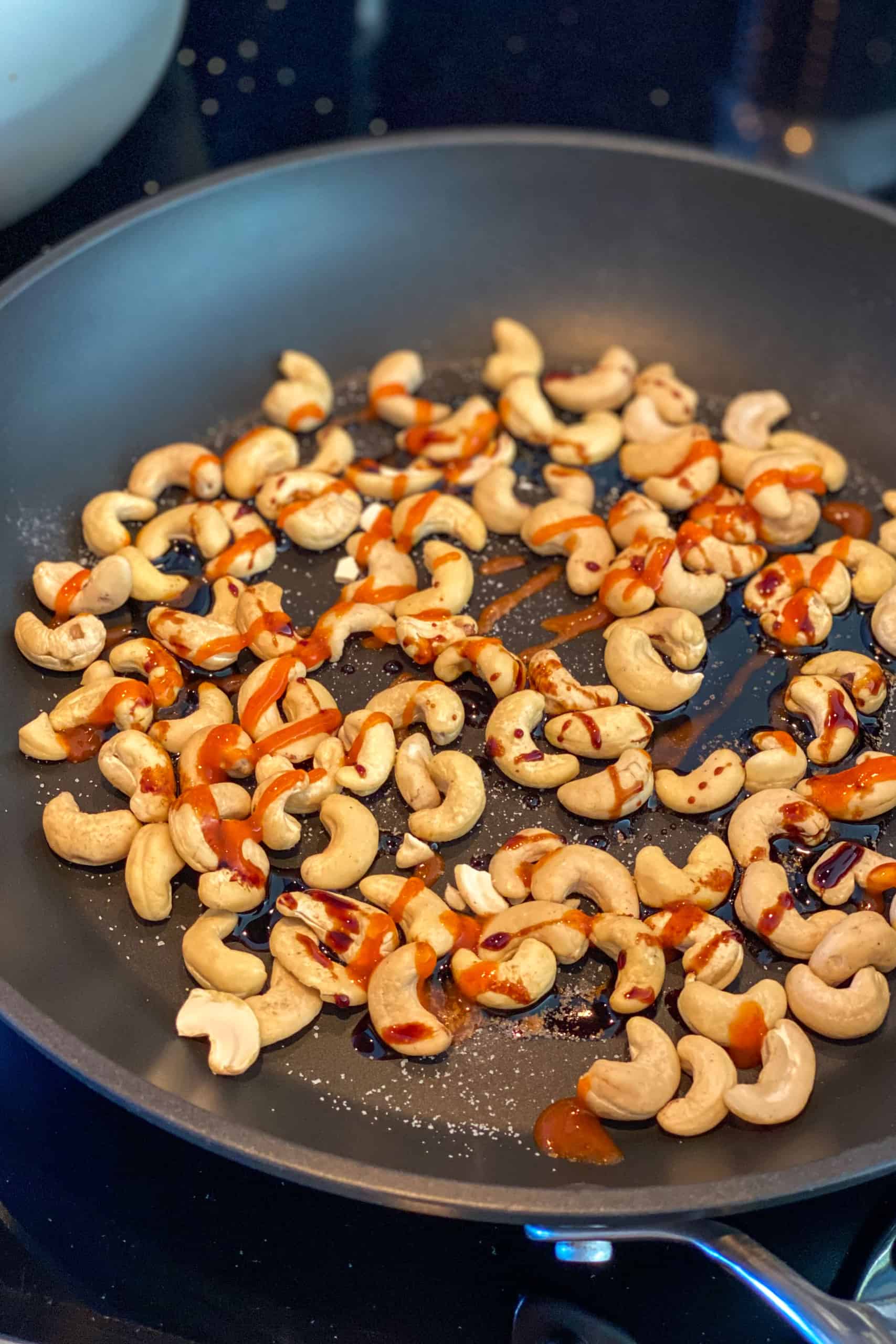 - Strooi een snufje zeezout over de noten, druppel de ketjap erover en voeg sriracha naar smaak toe. Ik hou van pit, dus ik neep flink in de fles. Schep de cashewnoten rustig om tot de sauzen goed verdeel zijn.