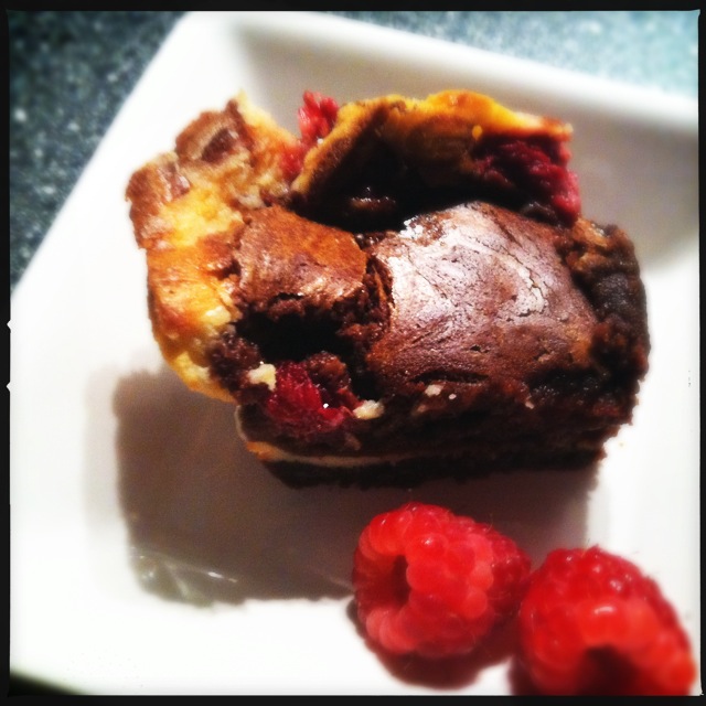 Giet daarna het resterende chocolademengsel erover en maak een marmereffect (bruin en wit door elkaar heen) met de tanden van een vork. Verdeel de frambozen erover en duw die een beetje in het mengsel. Â