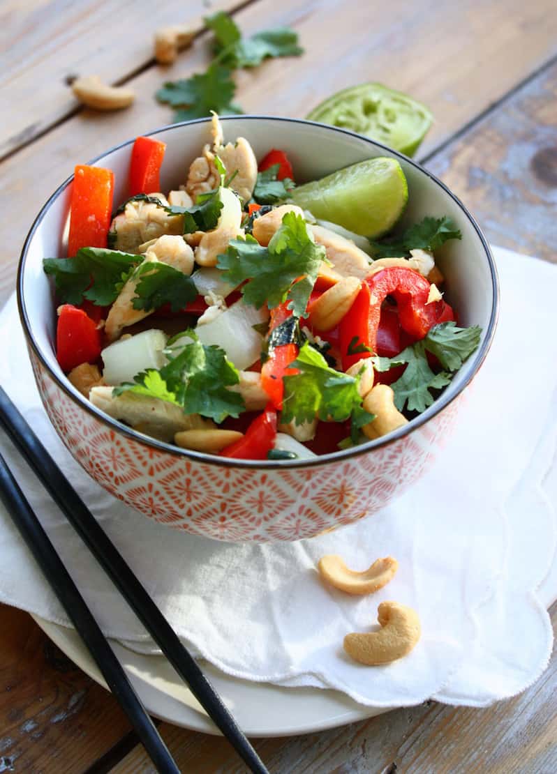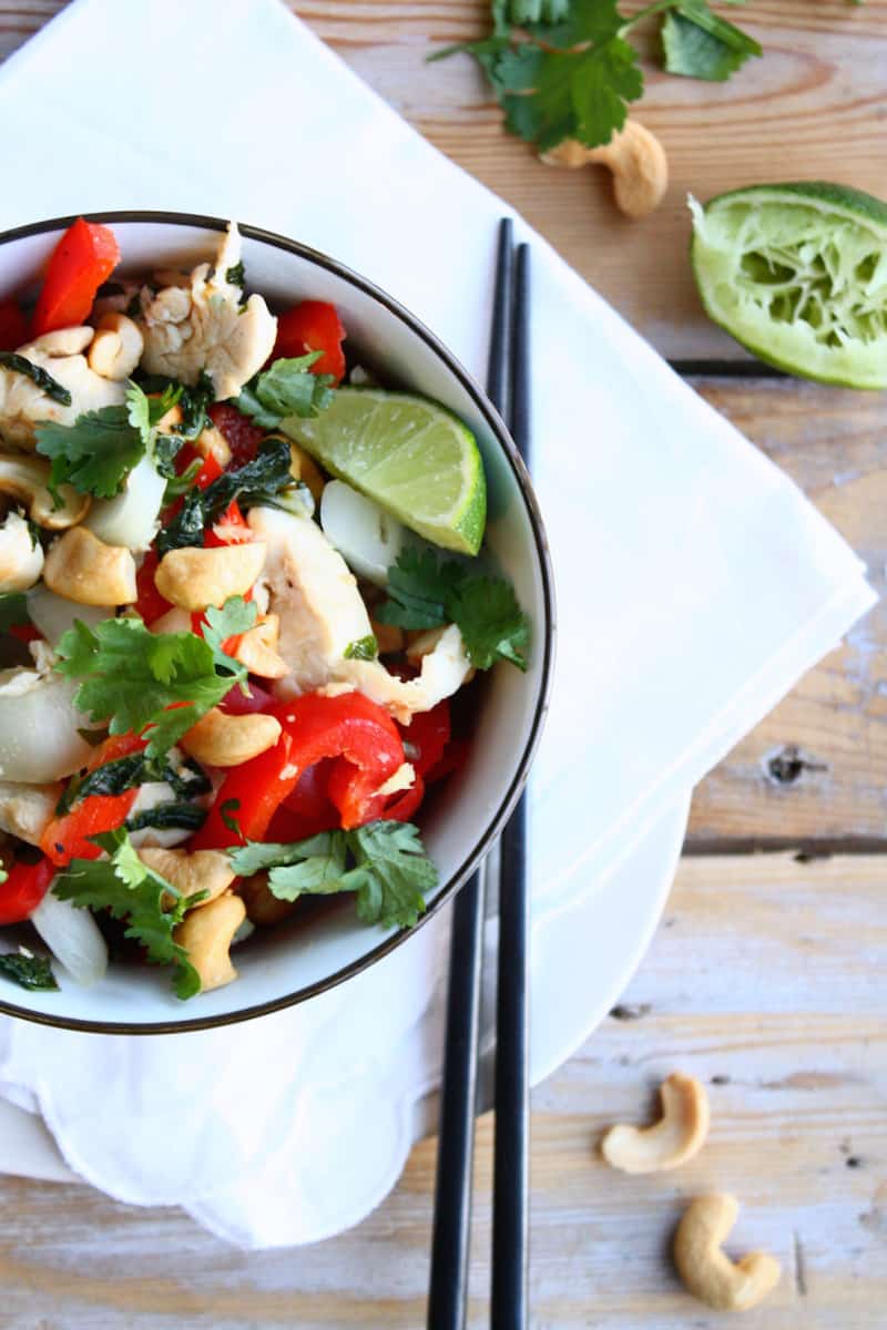Serveer de Chinese kip in kommen en garneer met een paar blaadjes koriander, lente ui, cashewnoten en een partje limoen. Als finishing touch nog een drupje sesamolie en serveer gelijk.