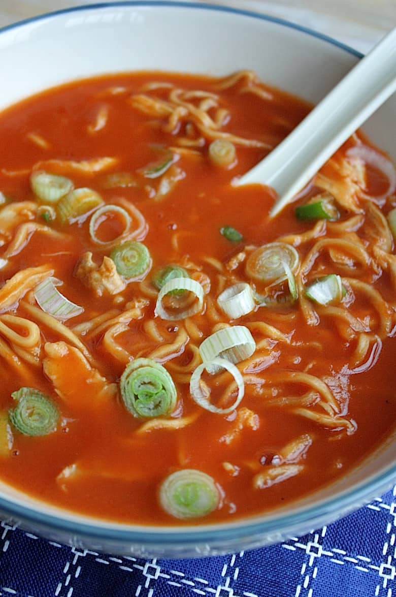 Serveer de soep in komen met een beetje noedels en wat ringetjes lente ui.