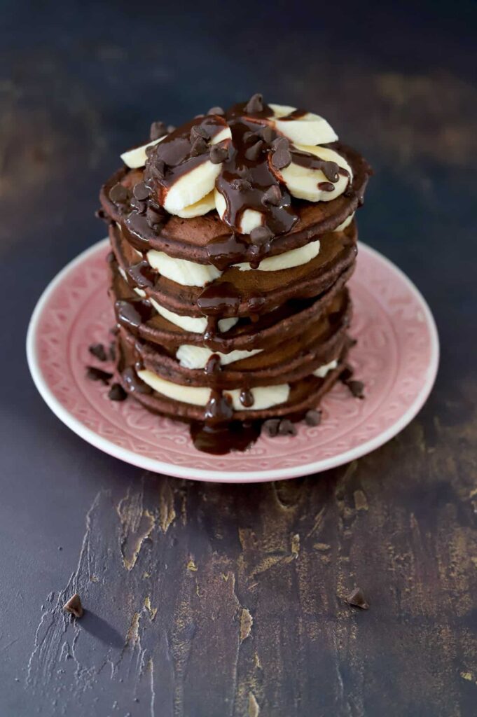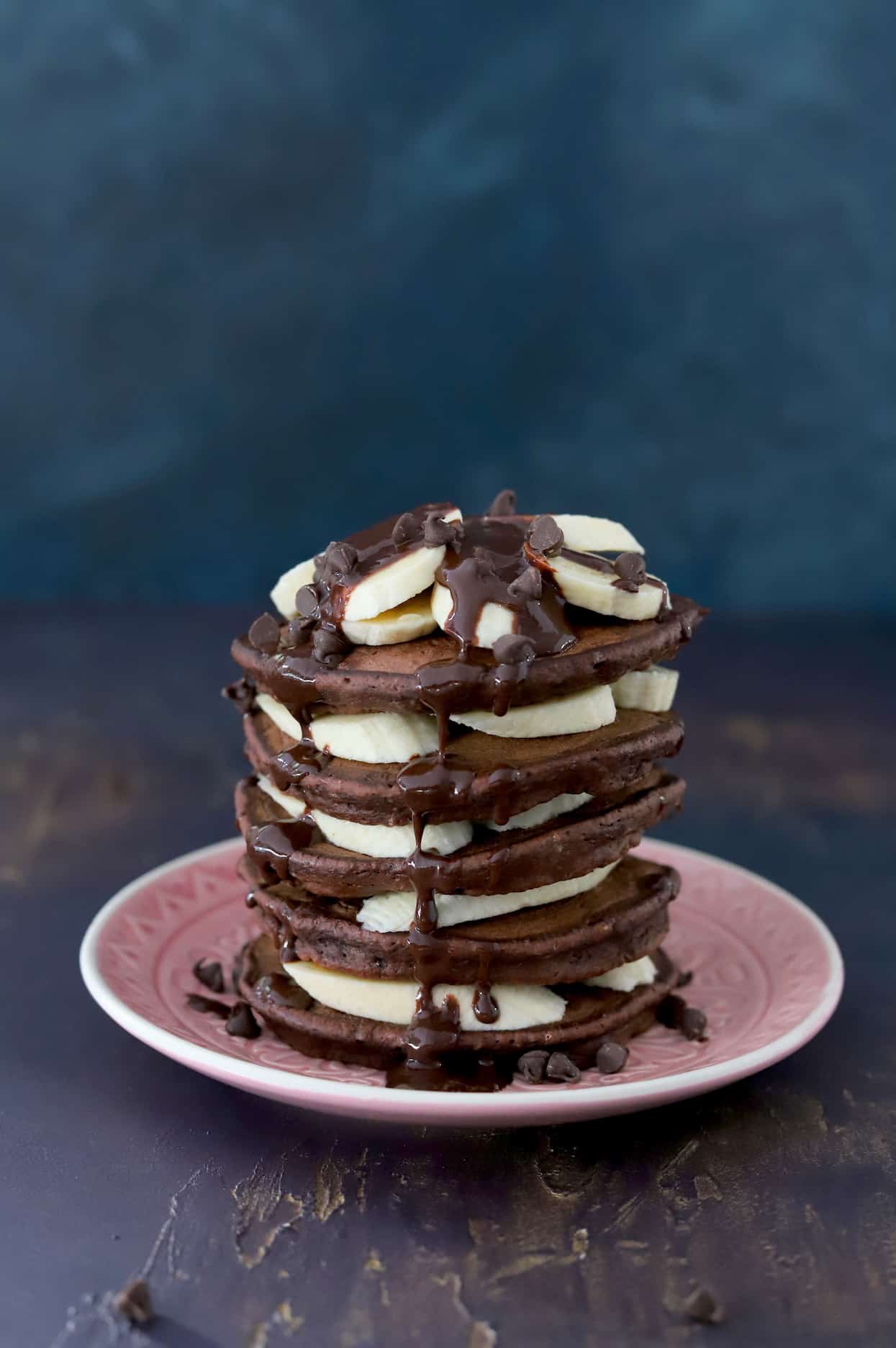 - Serveer de pancakes met plakjes banaan, de chocoladesaus en eventueel nog wat chocochips. Of maak er helemaal een feestje van door er een echte pancake toren van te bouwen zoals ik deed 🙂