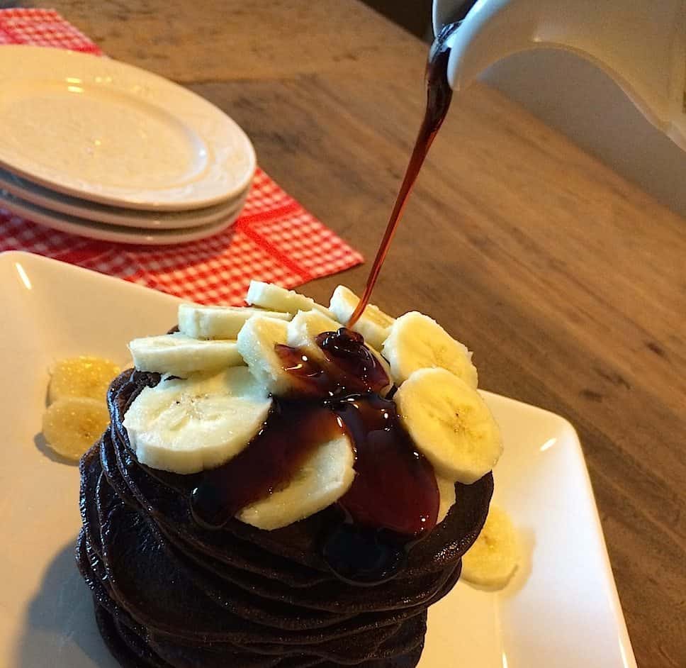 Serveer de pannenkoeken met plakjes banaan en maple syrup. Enjoy!