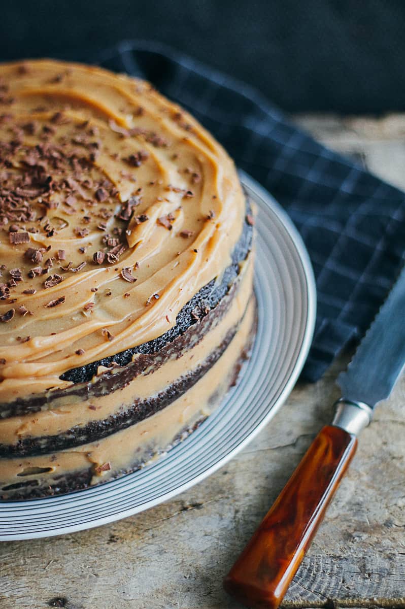 10. Om de cake op te bouwen smeer je tussen elke cakelaag een royale laag karamel-botercrème en bovenop ook. Een paletmes is hierbij een handig hulpmiddel.