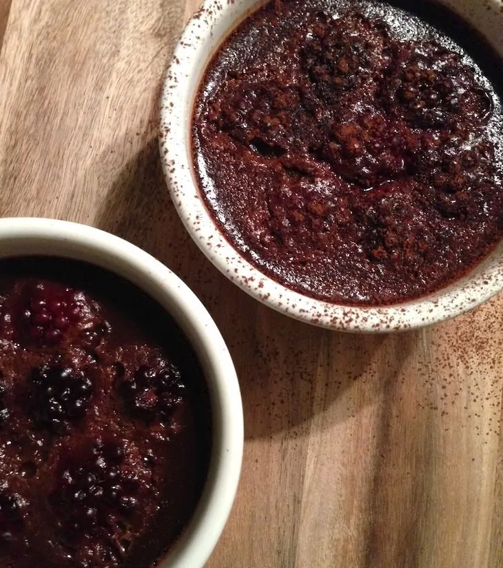 Neem 4 kleine ovenvaste schaaltjes en verdeel hier de bramen over. Schenk daarna het chocolademengsel erover en verdeel dit over de 4 schaaltjes. Zet de schaaltjes in de oven voor 30-35 minuten.