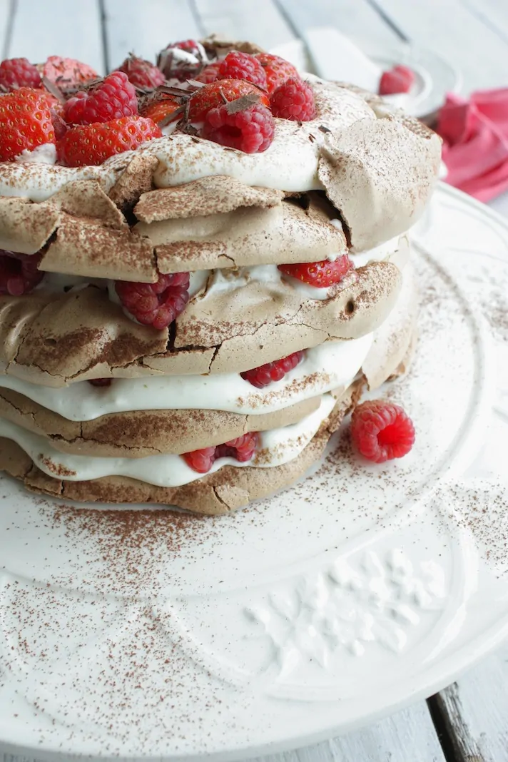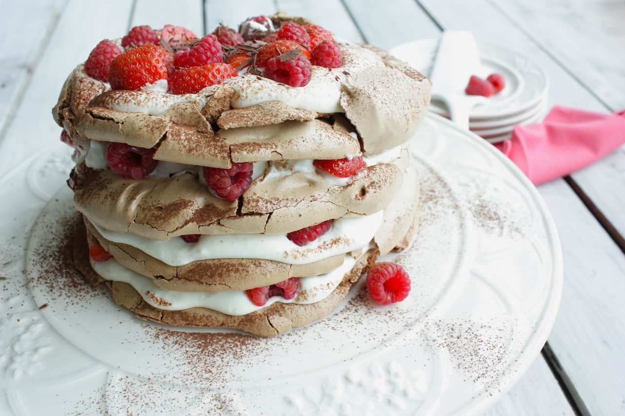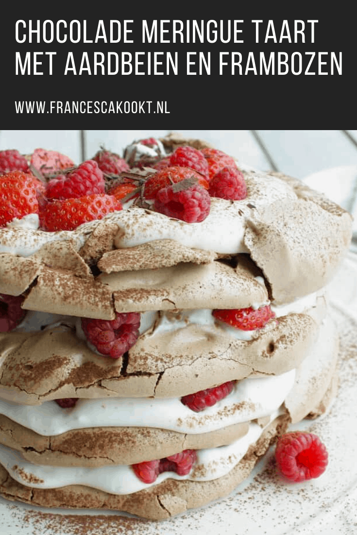 Wat is een leven zonder meringues. Ik heb echt geen idee. Klop wat eiwitten fijn, voeg er suiker aan toe, bak ze in de oven en zet je tanden in een brosse meringue met zachte yummy vulling. Laat die dingen maar aan mij over! Nou kun je de meringues ook wat groter maken. Stapel ze op elkaar met een vulling van geklopte slagroom en fruit en je hebt een meringue taart. Of pavlova taart, dat kan natuurlijk ook. Geinspireerd door Nigella en What Katie Ate maakte ik deze chocolade meringue taart met aardbeien en frambozen voor het 2-jarig bestaan van Francesca Kookt. De perfecte taart voor mijn verjaardag, niet ingewikkeld om te maken en puur genieten! En ja, we hebben er gewoon mee ontbeten 😉
