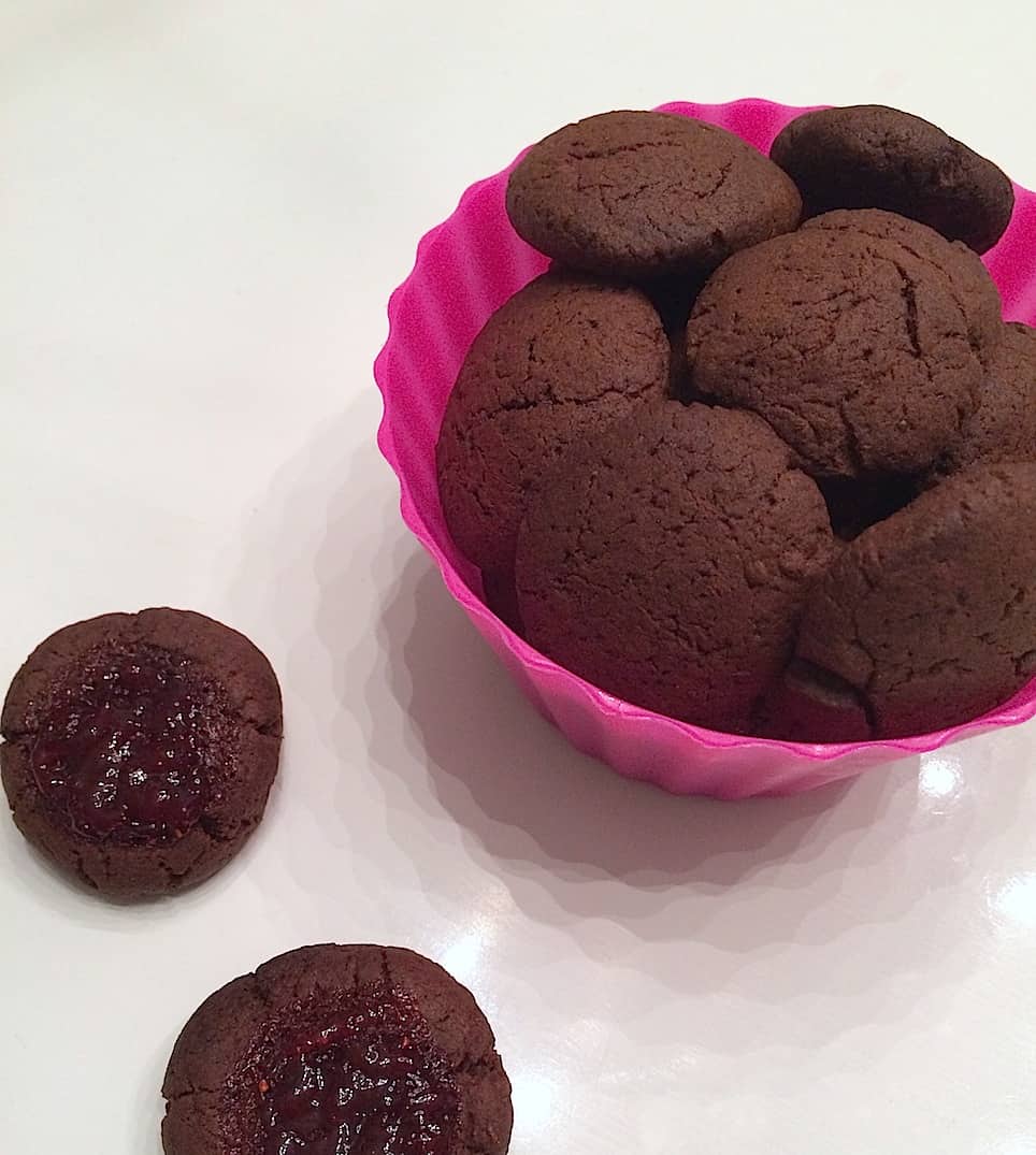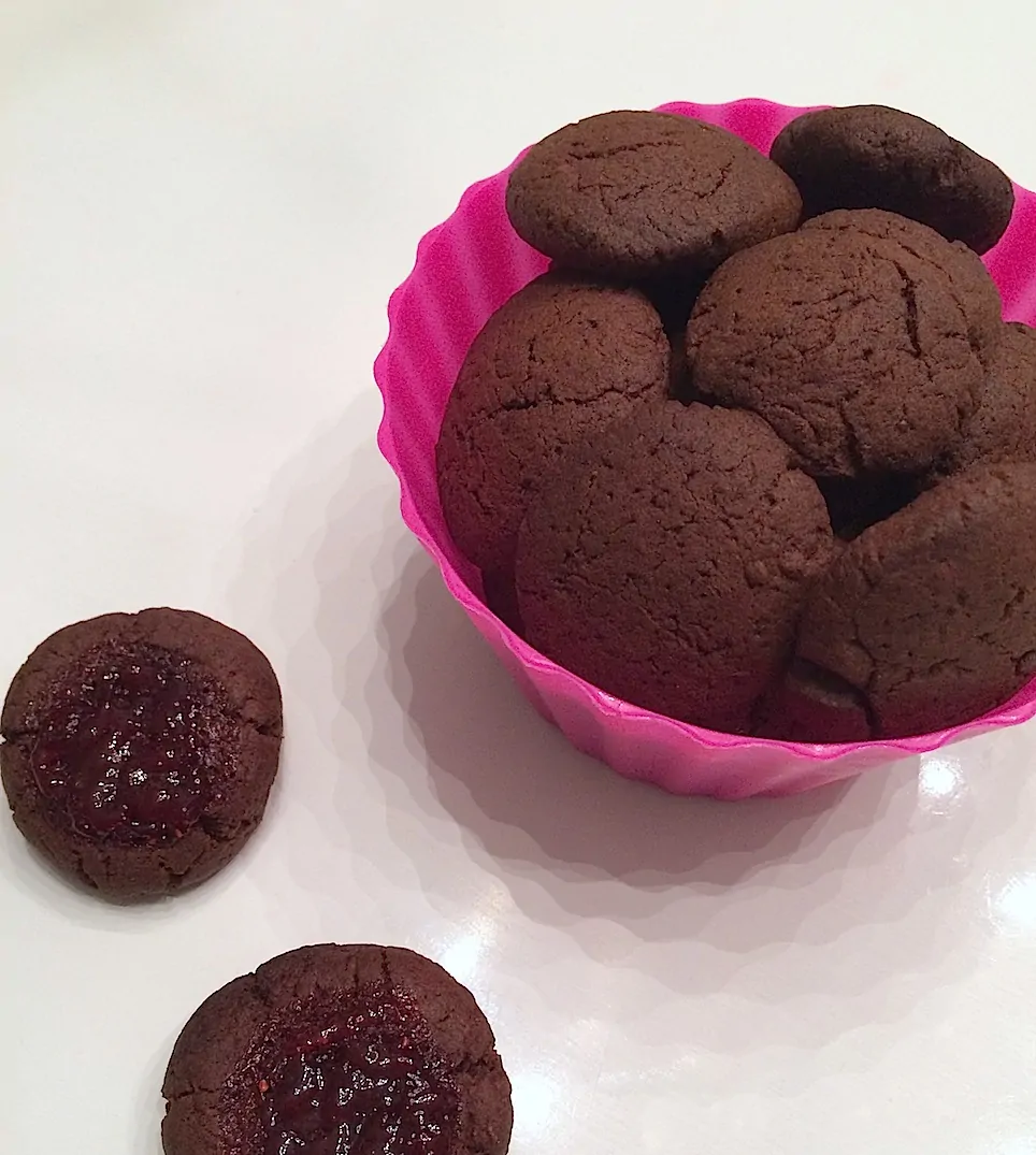 Tip: je kunt de koekjes ook vullen met jam voordat je ze in de oven doet. Maak dan een dik koekje waar je een kuiltje in maakt met je duim. Deze vul je met een theelepel jam voordat je ze gaat bakken.