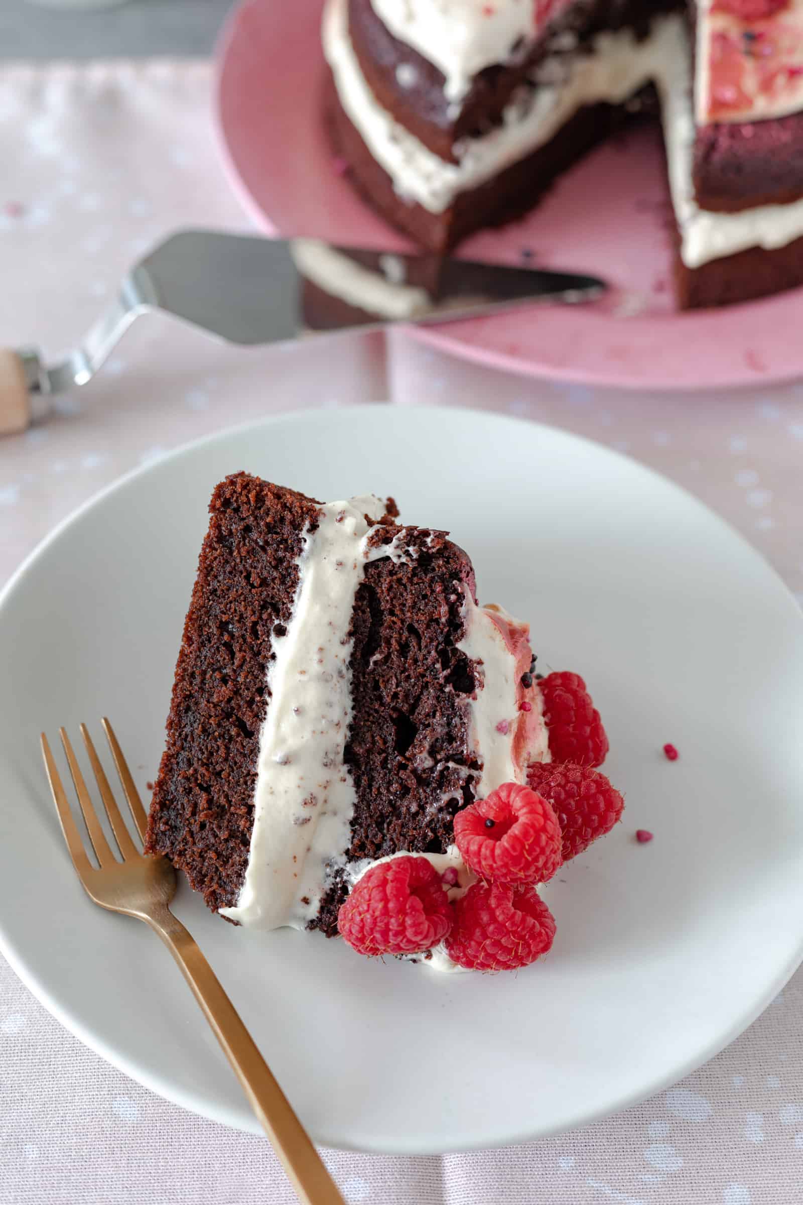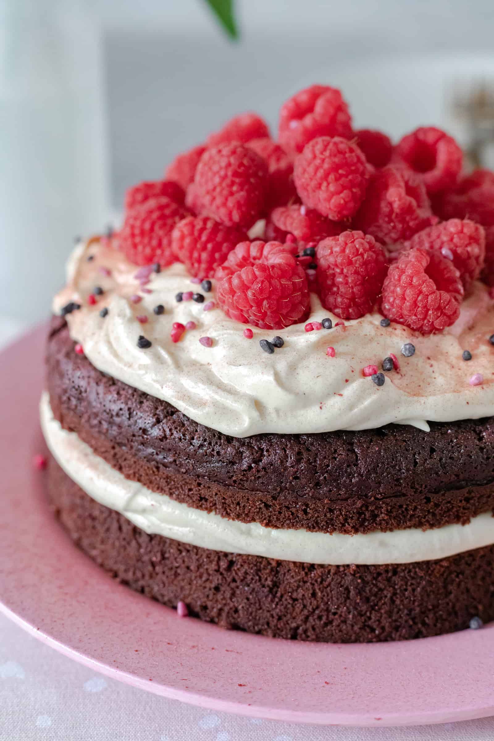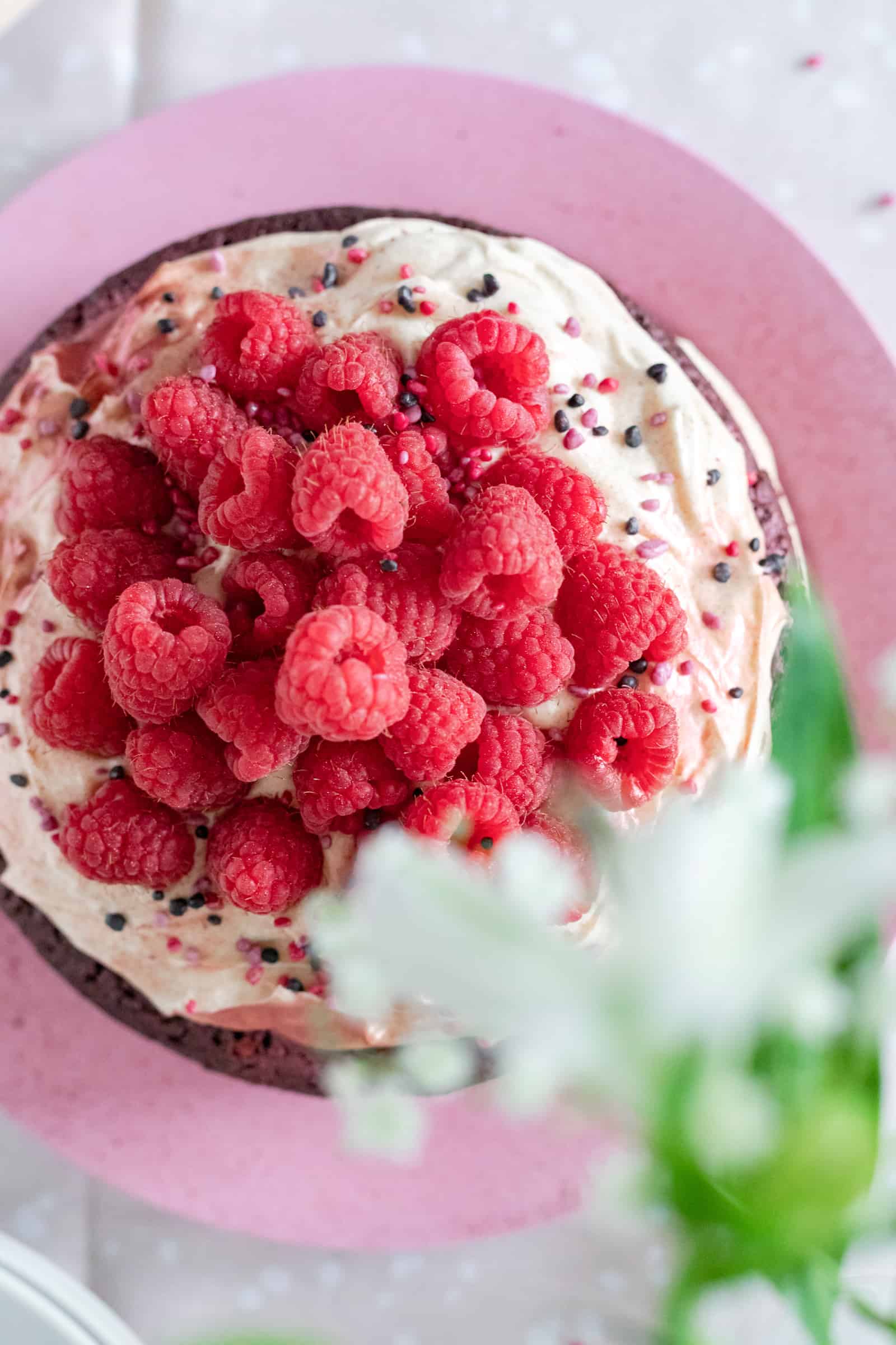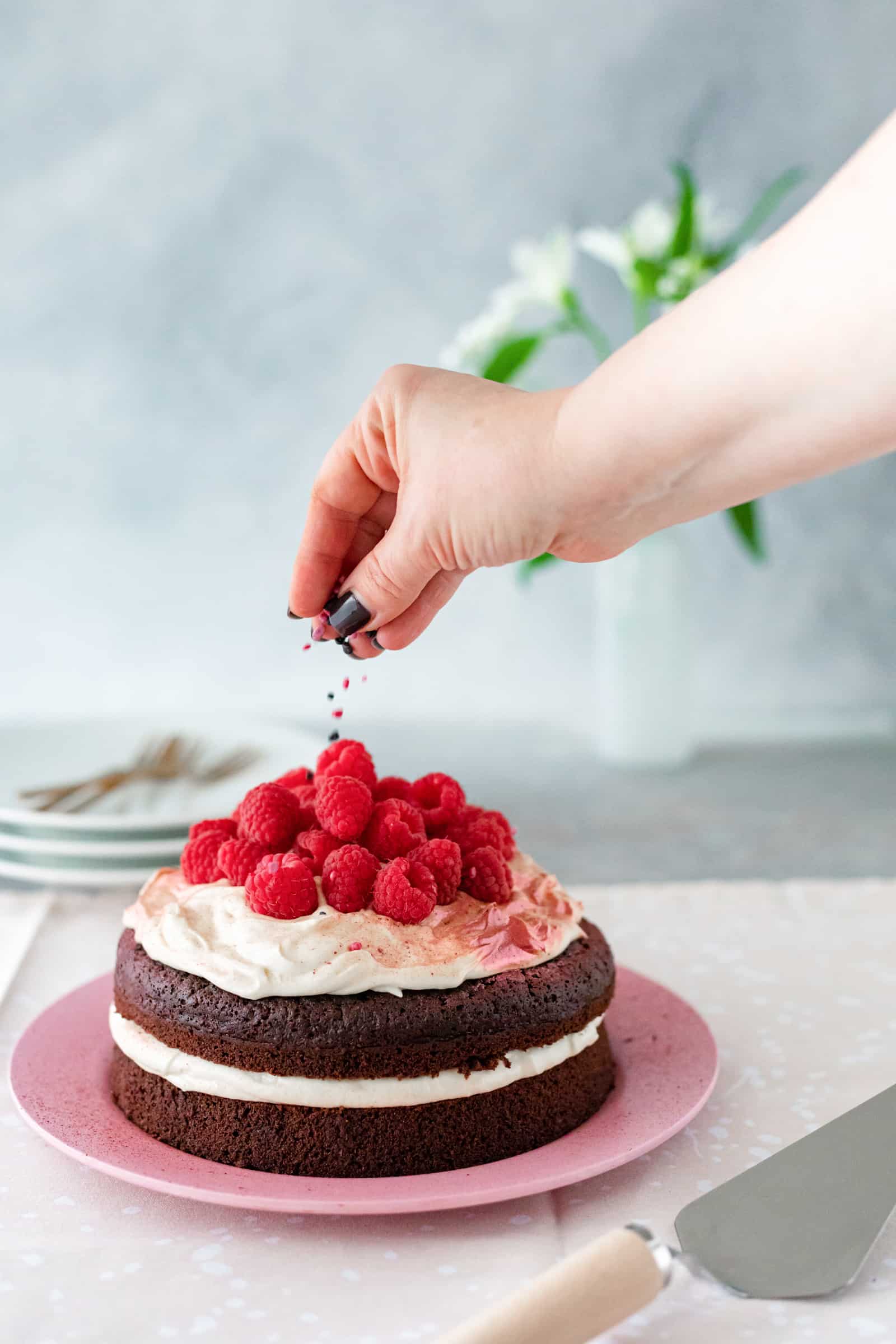 - Zet je chocoladecake op een mooi bord of taartplateau en bestrijk de bovenkant met de resterende frosting. Garneer dit met de verse frambozen en decoreer daarna, naar eigen inzicht, met sprinkles of kleurpoeder.