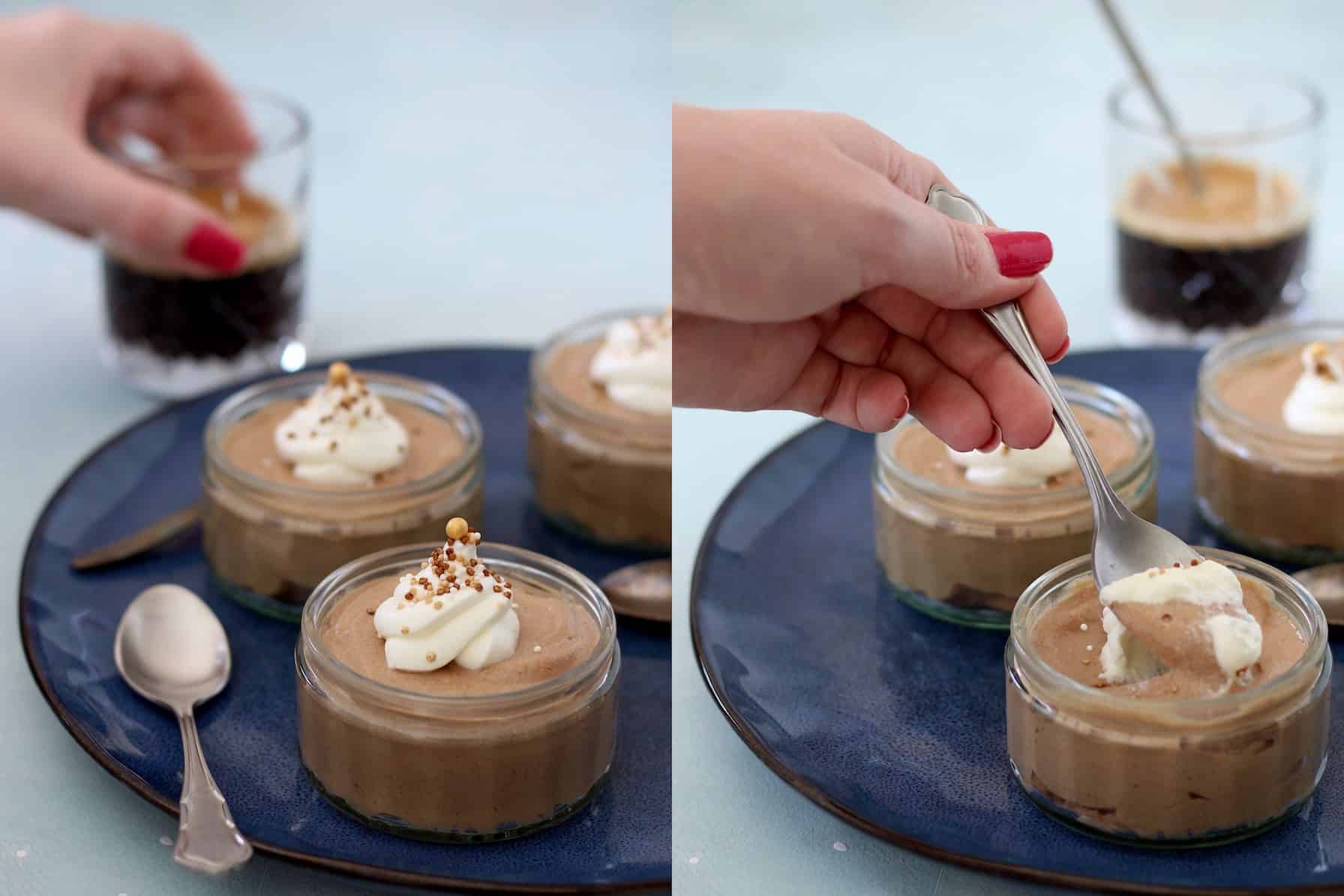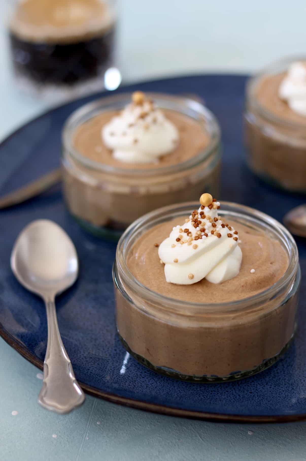 Chocolademousse is een perfect dessert om voor te bereiden. Hierna schep je het in mooie glazen of bakjes en bewaar je ze afgedekt in de koelkast tot het moment van serveren. In dit recept voegde ik wat koffie extract toe aan de chocolademousse wat een extra dimensie aan de smaak geeft. Ik hou enorm van de smaak van koffie en vond het een geweldige combinatie. Het koffie extract kocht ik hier, maar je kunt het ook vervangen door 2 tl zeer sterke espresso koffie (liever nog ristretto). Of kijk hier voor manieren hoe je zelf koffie extract kunt maken.