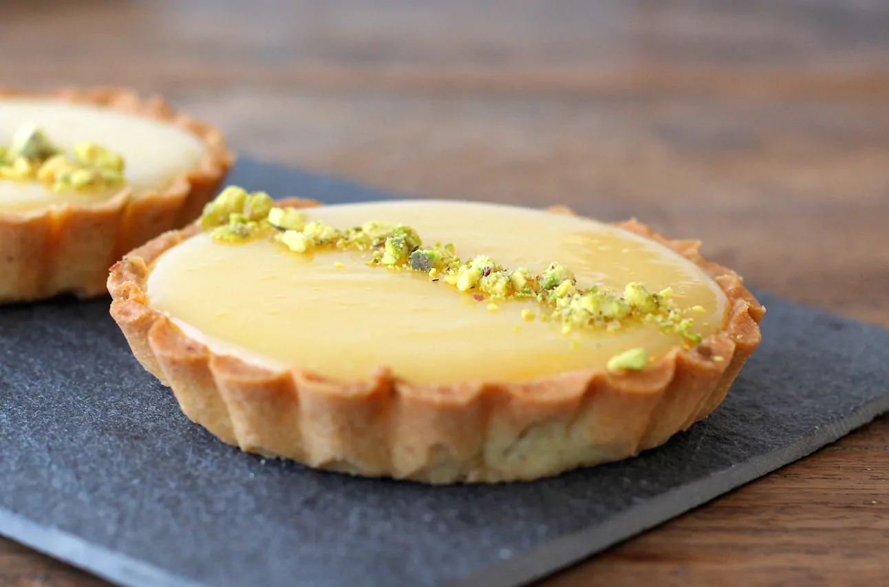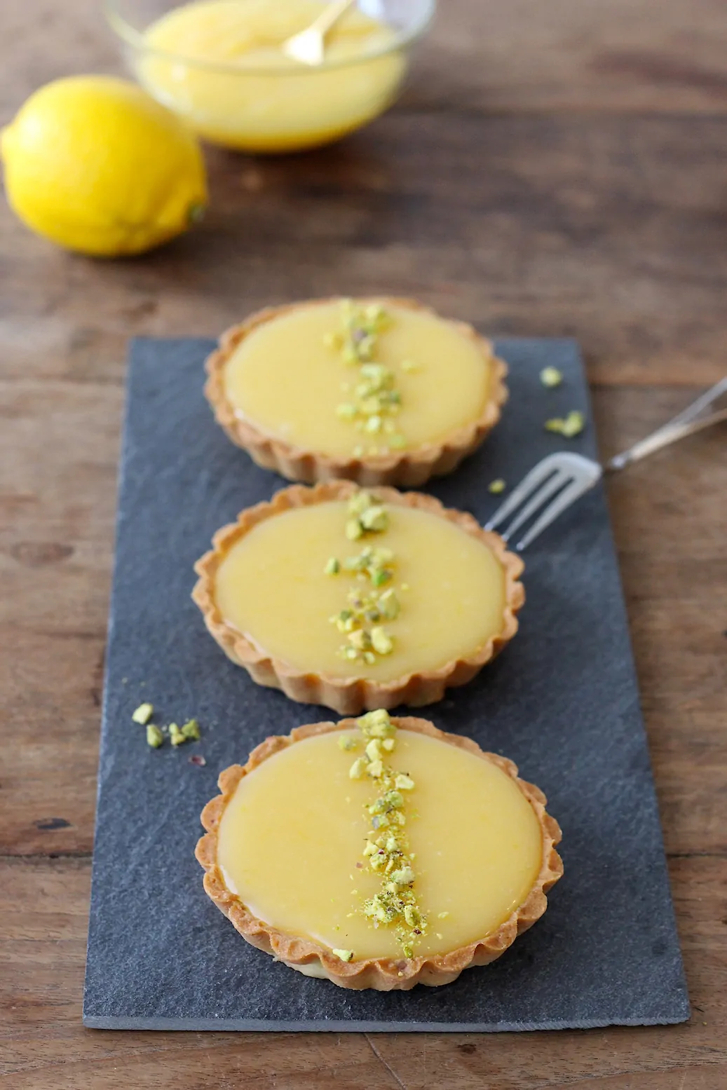 Als de bodems helemaal zijn afgekoeld haal je ze uit de vormpjes. Vul ze netjes tot de rand met de lemon curd en zet weer in de koelkast zodat ze kunnen opstijven. Bij voorkeur zeker een uur of 3. Maal in de tussentijd wat pistachenoten fijn tot medium. Hiermee decoreer je de taartjes vlak voordat je ze serveert.