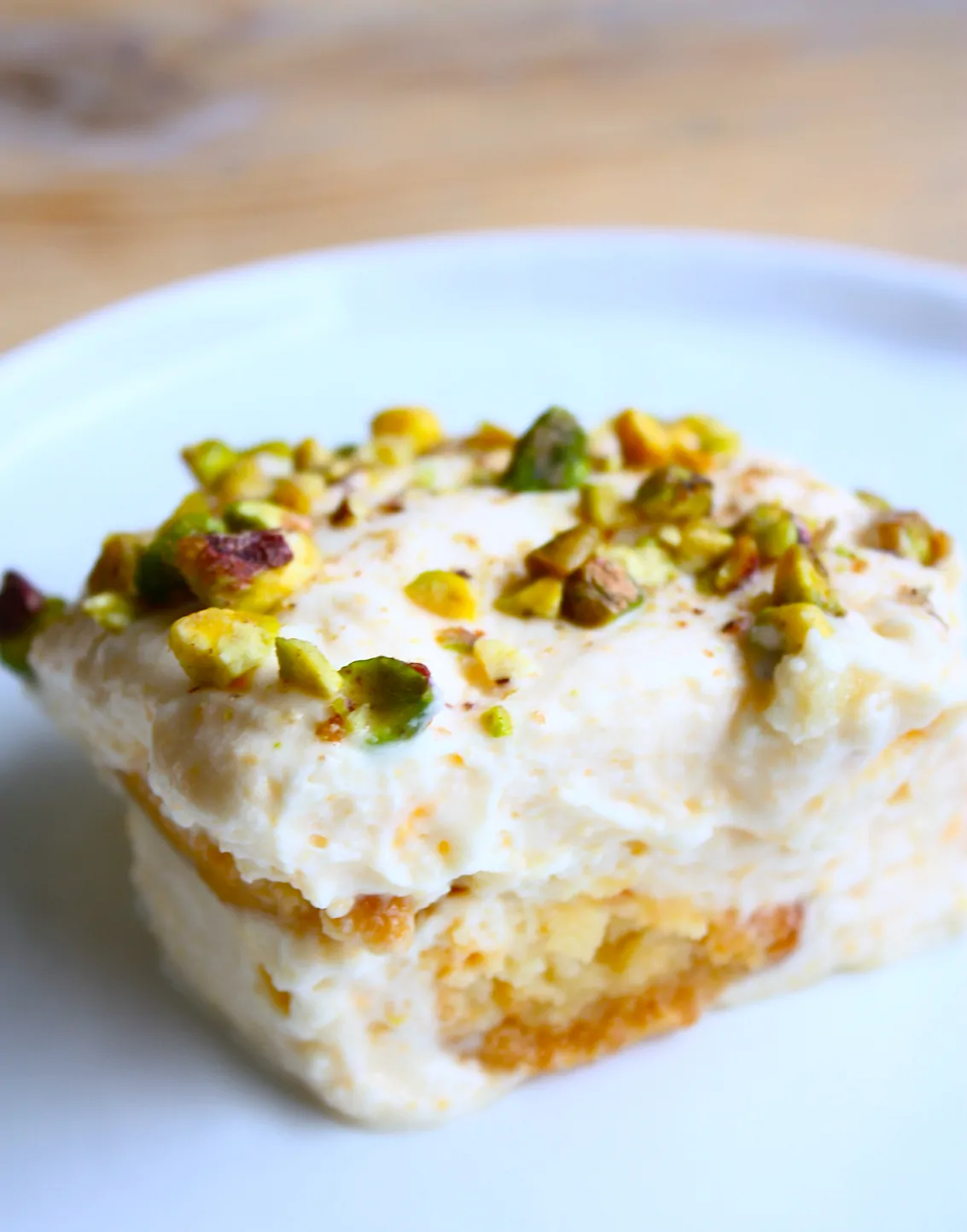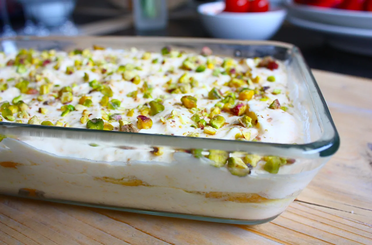 Nu heb je een kom met afgekoelde citroen ‘zabaglione’, een kom met citroensiroop, kom met mascarpone, kom met stijve eiwitten, zachte amarettikoekjes en een bakje geroosterde pistachenoten. Het is tijd om de tiramisu op te bouwen.