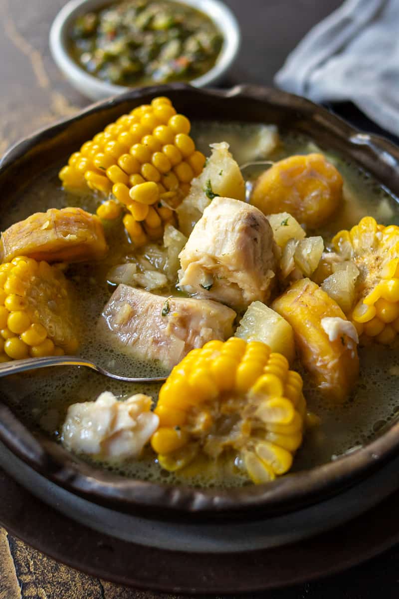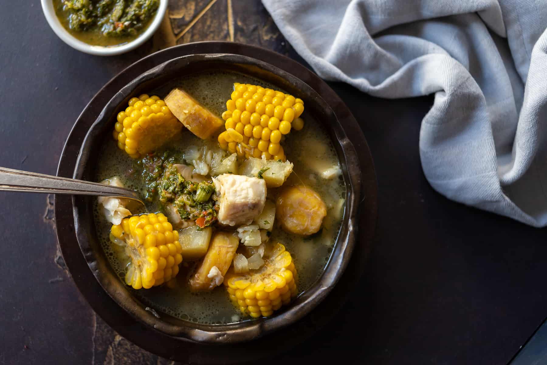 De groene bakbanaan, cassave en vissengraat zorgen ervoor dat de soep wat verdikt en de maïs is een lekkere zoete afwisseling. Daarnaast eet je deze soep met een flinke lepel ají en dat, lieve mensen, zorgt voor zoveel meer gelaagdheid in de soep.