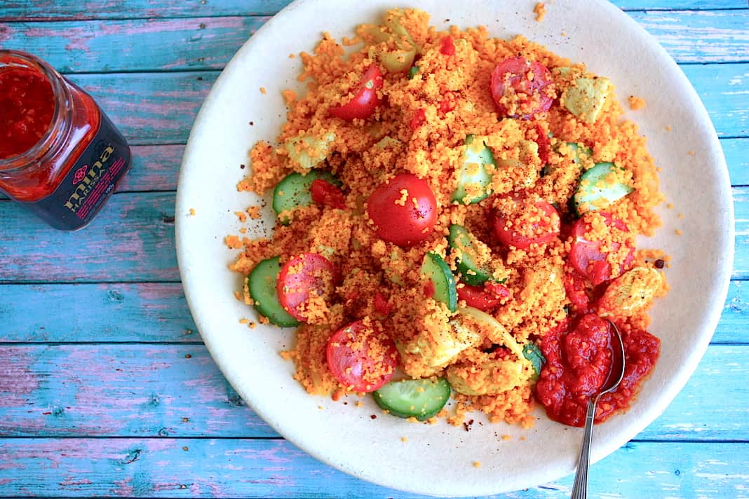 Het eindresultaat was een hele smakelijke couscous, waarvan ik de dag erna nog tijdens de lunch gesmuld heb. Ik ben vooral erg enthousiast over de sumak, wat een geweldig product is dat. De smaak ligt inderdaad tussen citroen en peper in en het maakte de couscous net wat specialer. Van de tomatencouscous had ik meer verwacht dat die naar tomaat zou smaken, de smaak is niet heel anders dan een ‘gewone’ couscous. De harissa lekker pittig, dus pas daar mee op als je nog wat minder gewend bent aan pit. En dan nu natuurlijk het recept voor jullie!
