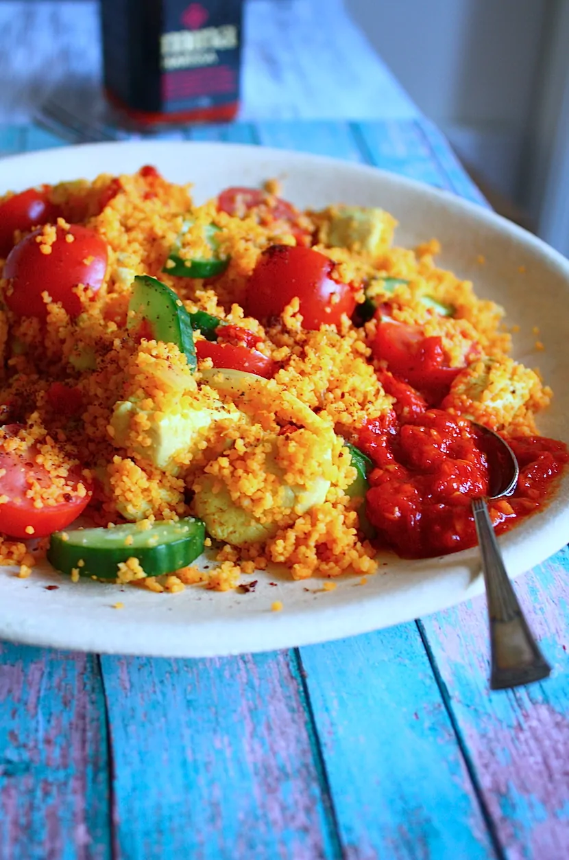 Het eindresultaat was een hele smakelijke couscous, waarvan ik de dag erna nog tijdens de lunch gesmuld heb. Ik ben vooral erg enthousiast over de sumak, wat een geweldig product is dat. De smaak ligt inderdaad tussen citroen en peper in en het maakte de couscous net wat specialer. Van de tomatencouscous had ik meer verwacht dat die naar tomaat zou smaken, de smaak is niet heel anders dan een ‘gewone’ couscous. De harissa lekker pittig, dus pas daar mee op als je nog wat minder gewend bent aan pit. En dan nu natuurlijk het recept voor jullie!