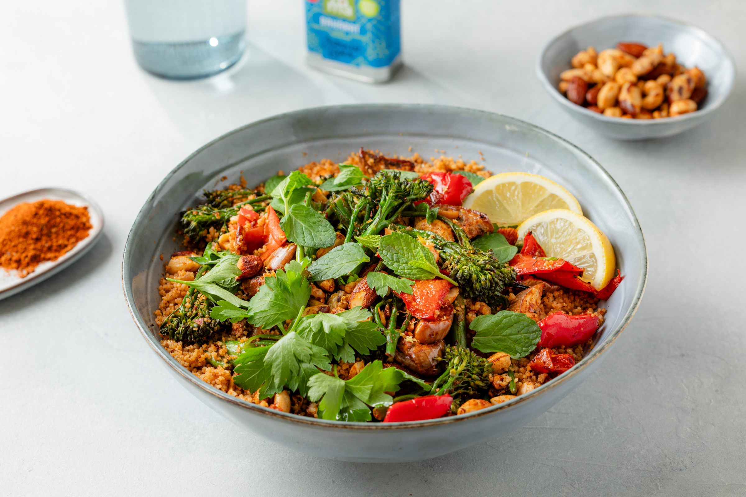 - Meng ondertussen de couscous met 200 ml kokend water in een kom en dek deze af. Laat 10 minuten wellen.