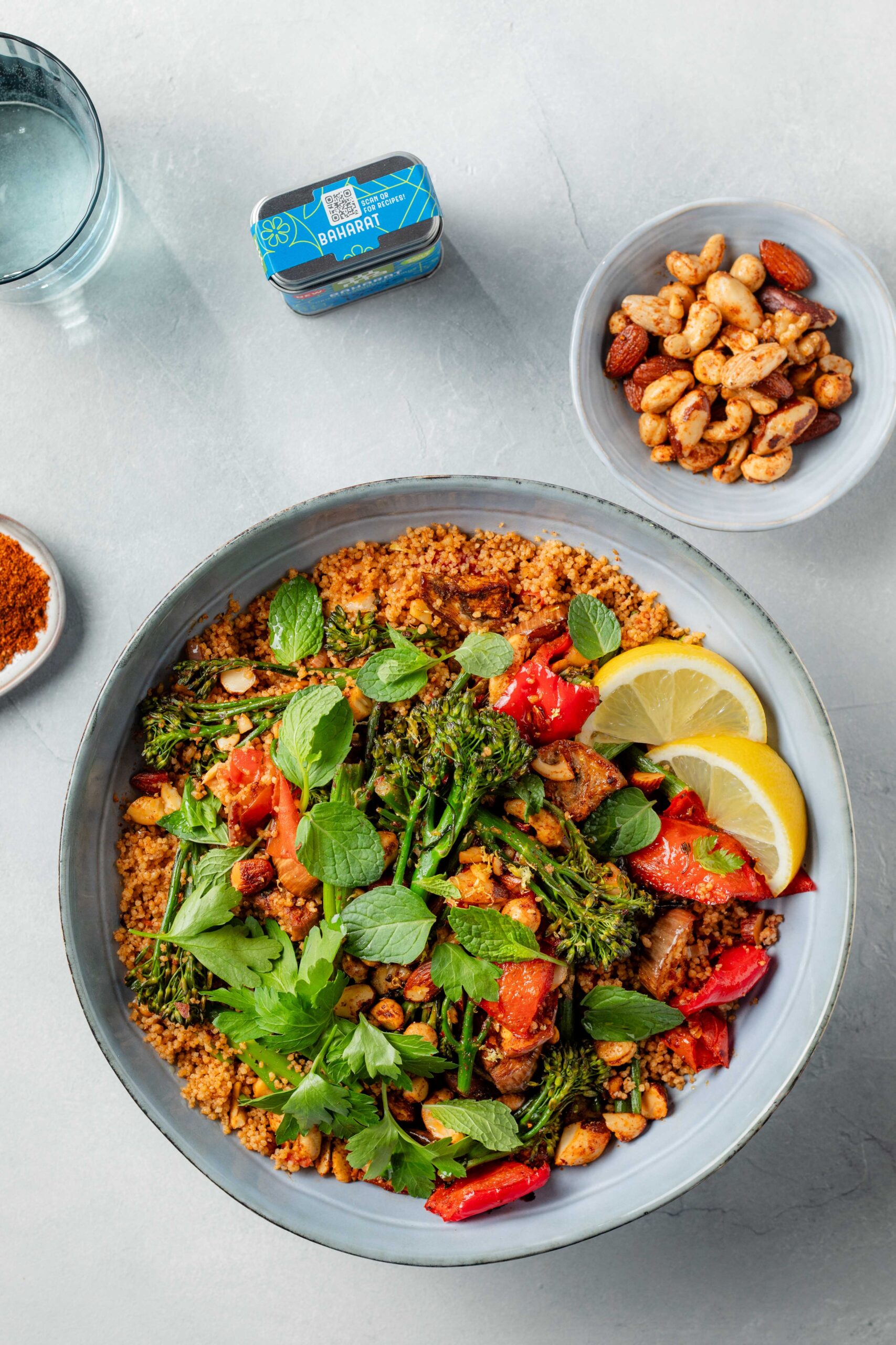 Samenwerking – Ben je op zoek naar een smaakvolle maaltijdsalade boordevol groenten, kruiden en smaak, maar zonder toegevoegd zout? Dan zit je met deze couscoussalade helemaal goed. In dit recept draait alles om het samenspel van pure smaken: van geroosterde aubergine en puntpaprika tot een kruidige tomatensaus, frisse citroen, het warme, aromatische karakter van de Euroma Baharat specerijen en de bite van de kruidige nootjes.