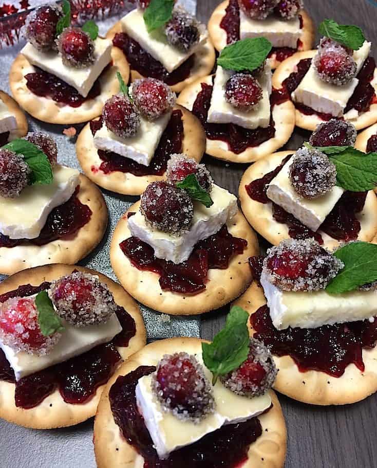 Snijd dunne plakjes van de brie die passen op de cracker. Besmeer vervolgens de crackers met een volle theelepel van de cranberry chutney. Leg hier een plakje brie op en garneer met gesuikerde cranberries en een blaadje munt. Serveer direct.