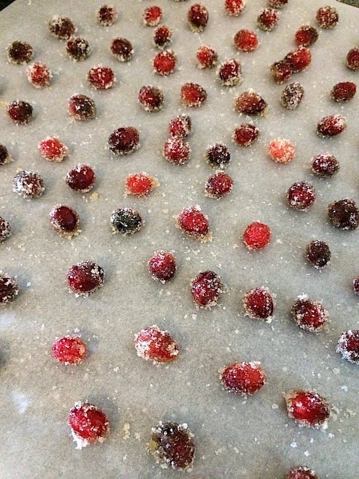 Laat de cranberries met de ahornsiroop uitlekken in een vergiet. Bekleed een bakblik met bakpapier en zet deze klaar op het aanrecht. Zet daarnaast een plat bord met de kristalsuiker. Rol nu vervolgens iedere cranberry door de suiker totdat ze een mooi gesuikerd laagje hebben. Leg ze te drogen op het bakpapier, na ongeveer 1,5 uur zijn ze droog en hard. Proef maar eens!