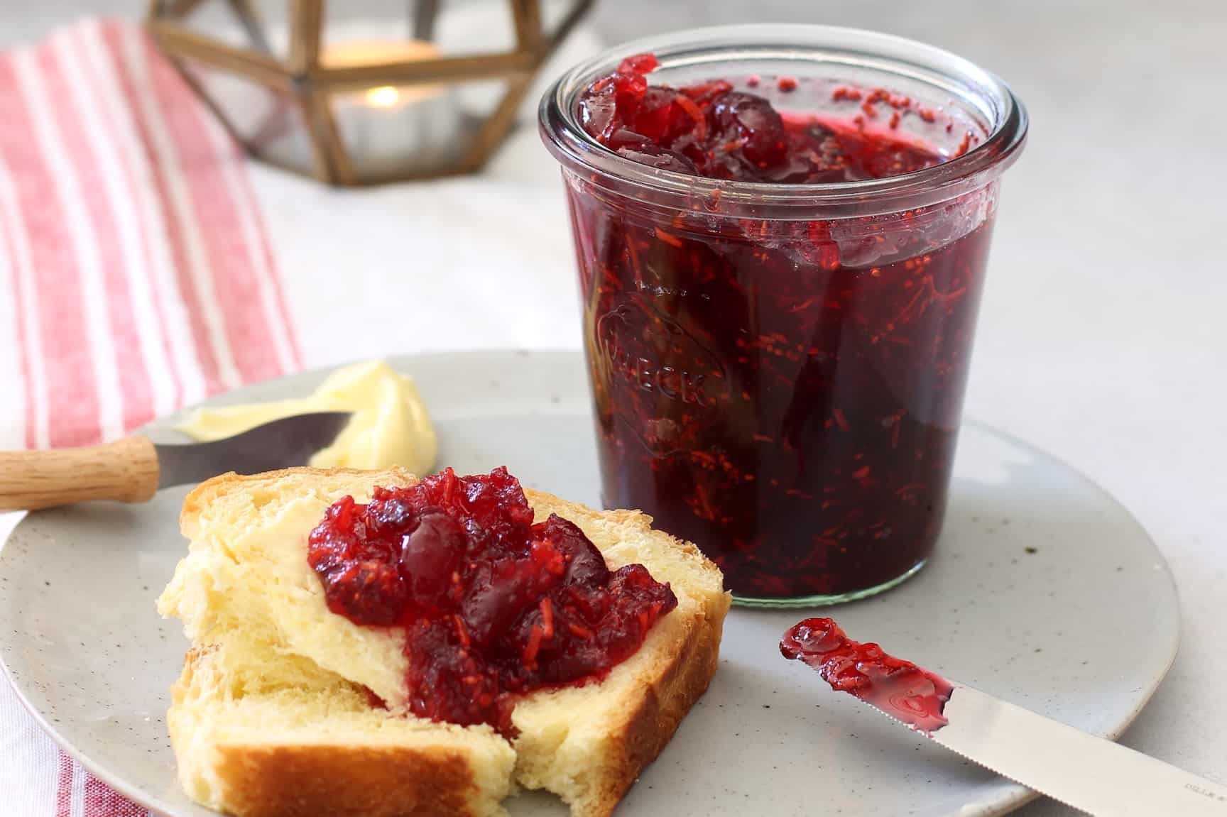 Ik heb niet heel veel nodig tijdens het kerstontbijt. Geef me een cappuccino, vers sapje, knapperig brood, gezouten boter en echt lekkere jam en ik ben al helemaal blij. Vooral als je me laat ontbijten met deze cranberryjam met wortel en kardemom. Een geweldige jam voor de kerstdagen en daarna.