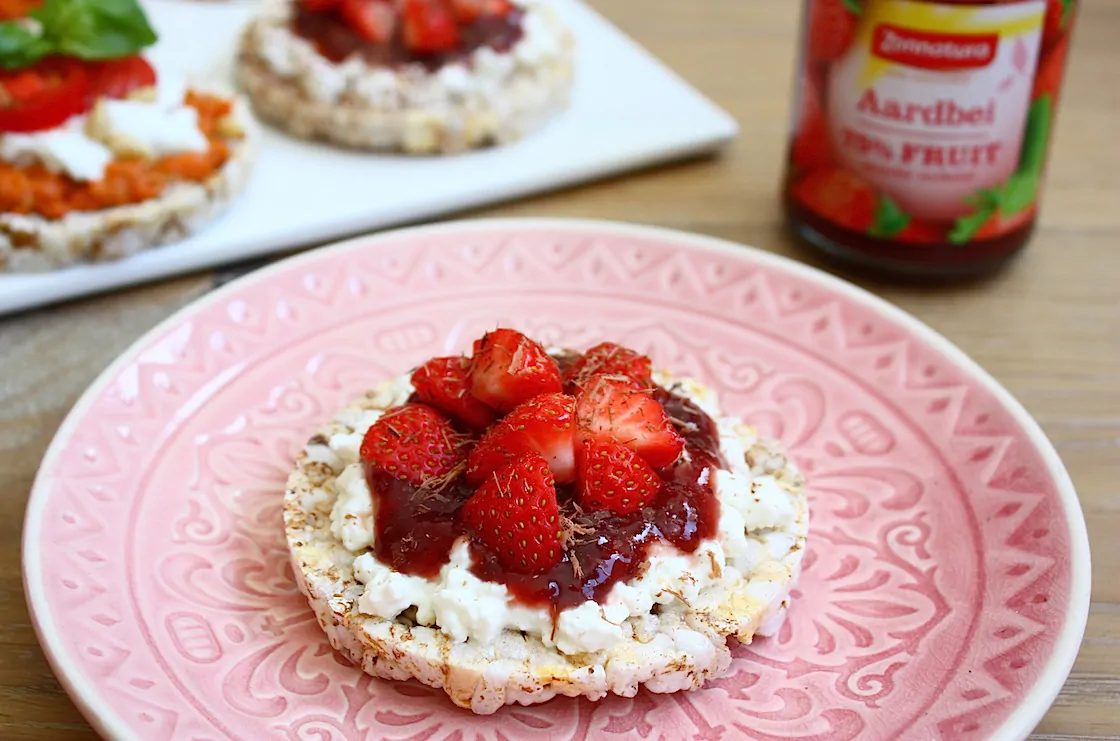 Nou, dit heeft niets meer te maken met een rijstwafel, dit is gewoon echt een taartje geworden! Als basis nam ik de boekweitwafel met quinoa en lijnzaad. Hierop heb ik een laagje huttenkase gesmeerd en daarop wat aardbei fruitspread. Nog een paar verse aardbeien ‘on top’ en als laatste rasp je er wat extra pure chocolade over. Genieten!