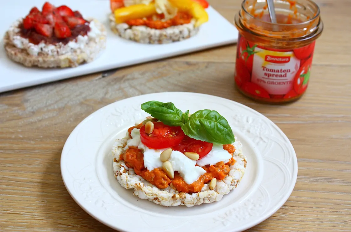 Wederom de speltwafel gebruikt en deze besmeerd met een laagje tomatenspread. Verder belegd met buffelmozzarella, plakjes cherrytomaat, basilicum en geroosterde pijnboompitten. Voor de liefhebbers kun je er ook nog wat druppeltjes olijfolie en balsamico over sprenkelen, maar niet teveel.