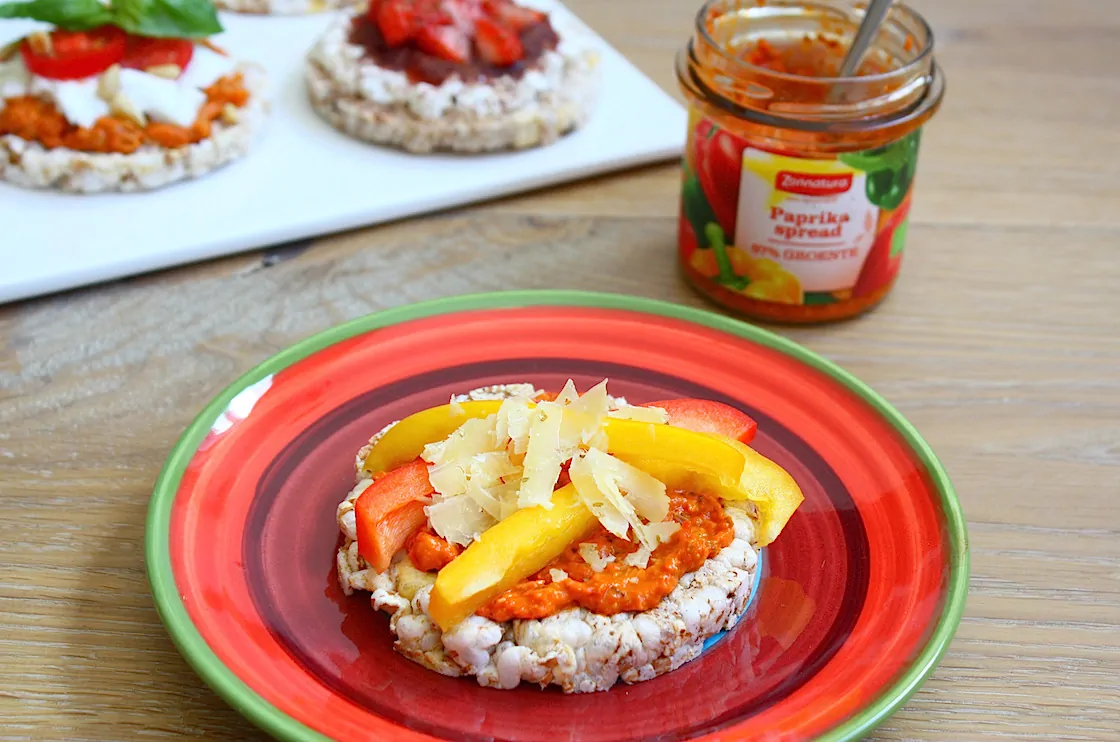 Als basis heb ik de speltwafel met quinoa, boekweit en gierst gebruikt. Smeer hier een laagje paprikaspread op en beleg verder met reepjes paprika en wat geschaafde oude kaas. Ik gebruikte oude Leidse kanter hiervoor. Zalige combi!