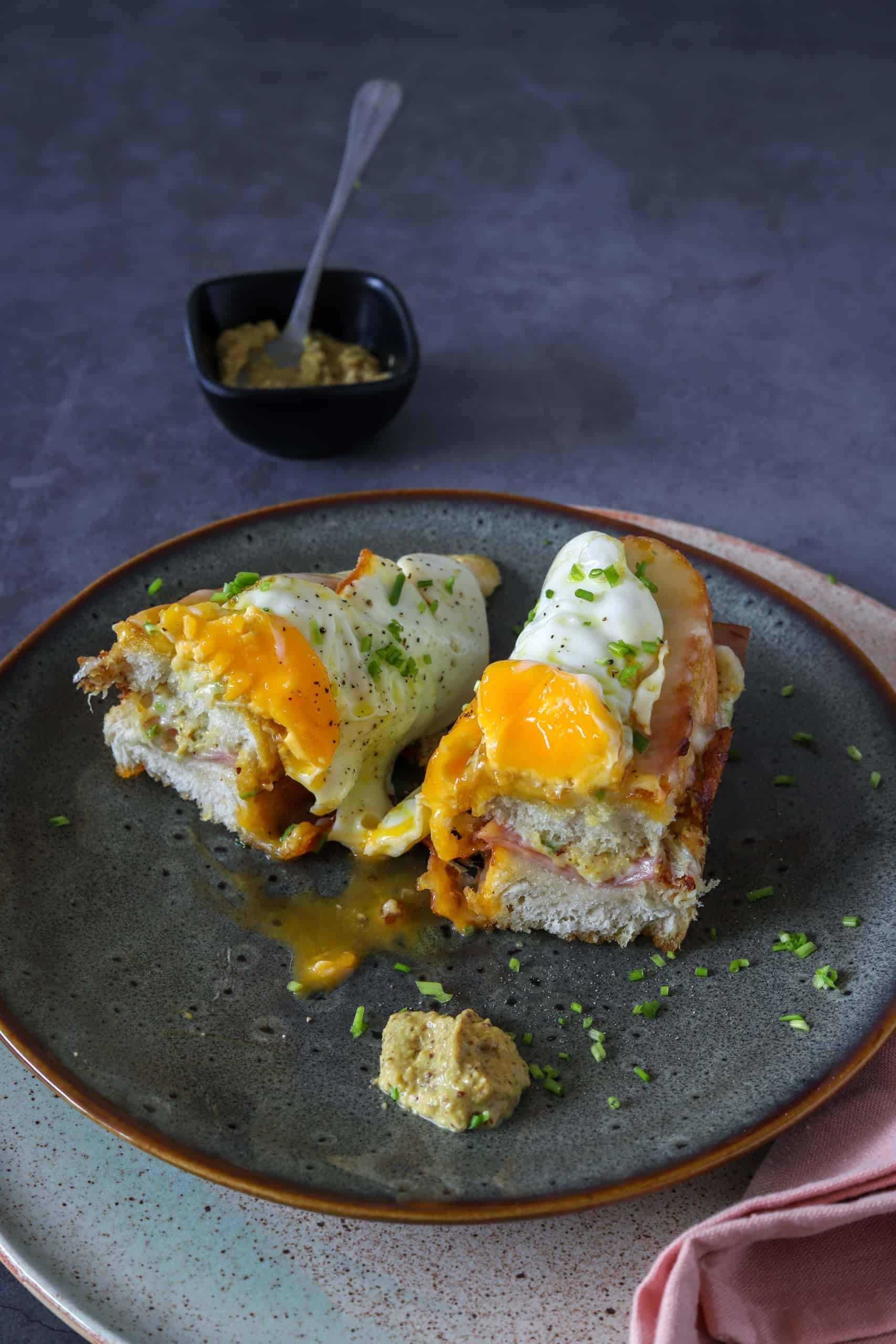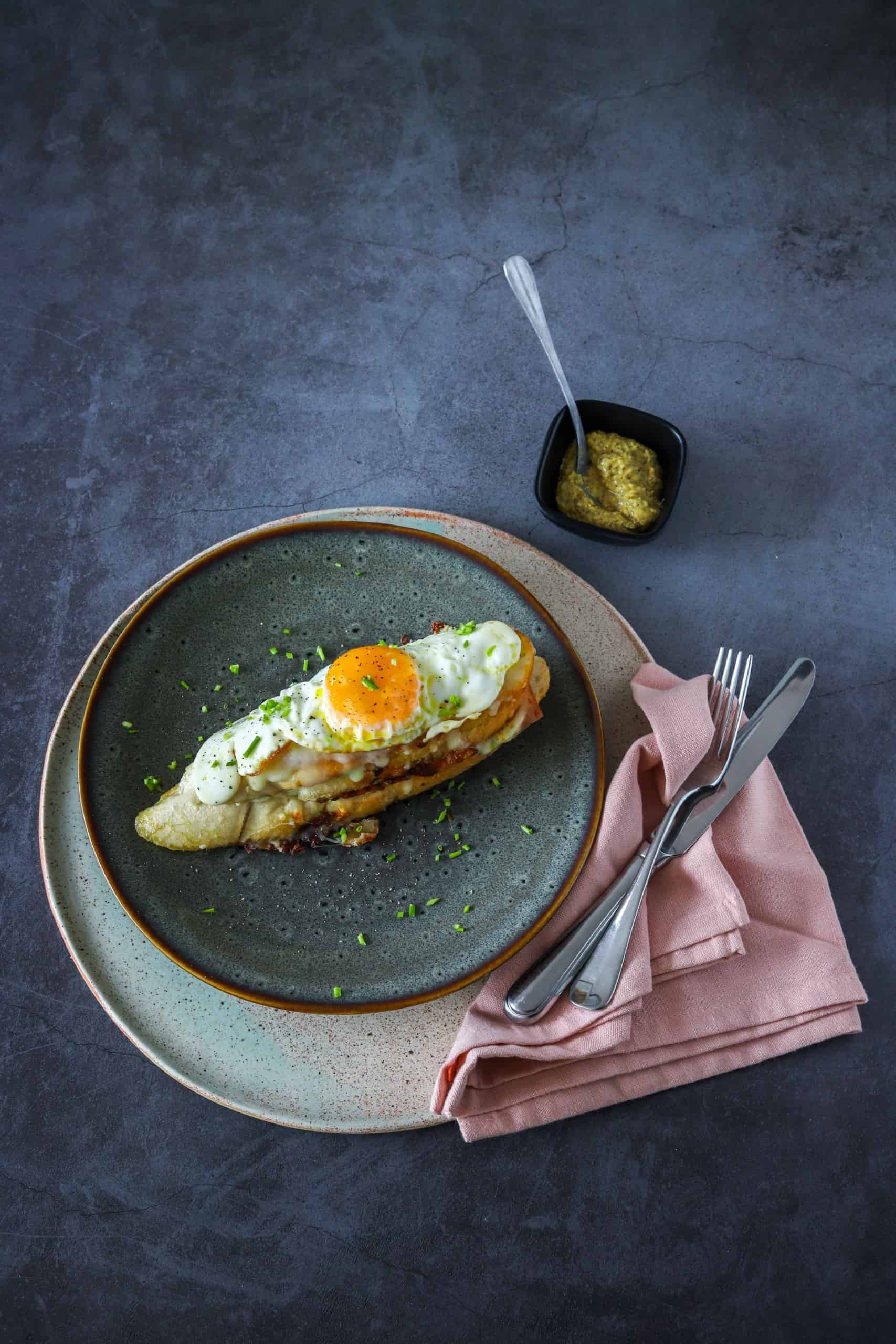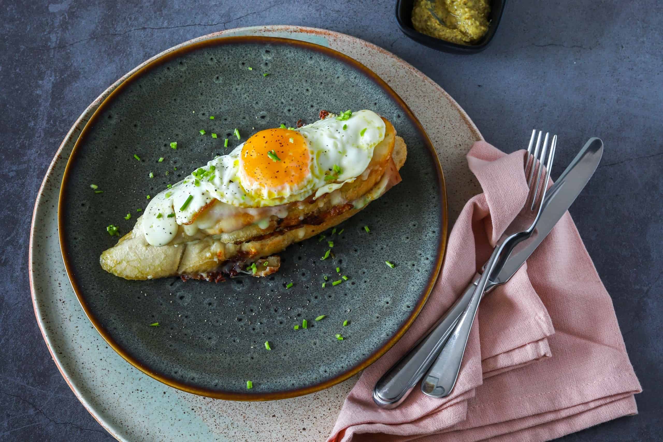 - Verdeel de gebakken stokbroodjes over 3 borden. Schep de spiegeleieren uit de pan en leg ze op de bovenkant van de croque madame. Strooi er nog wat zout en zwarte peper over en serveer met een bakje grove mosterd.
