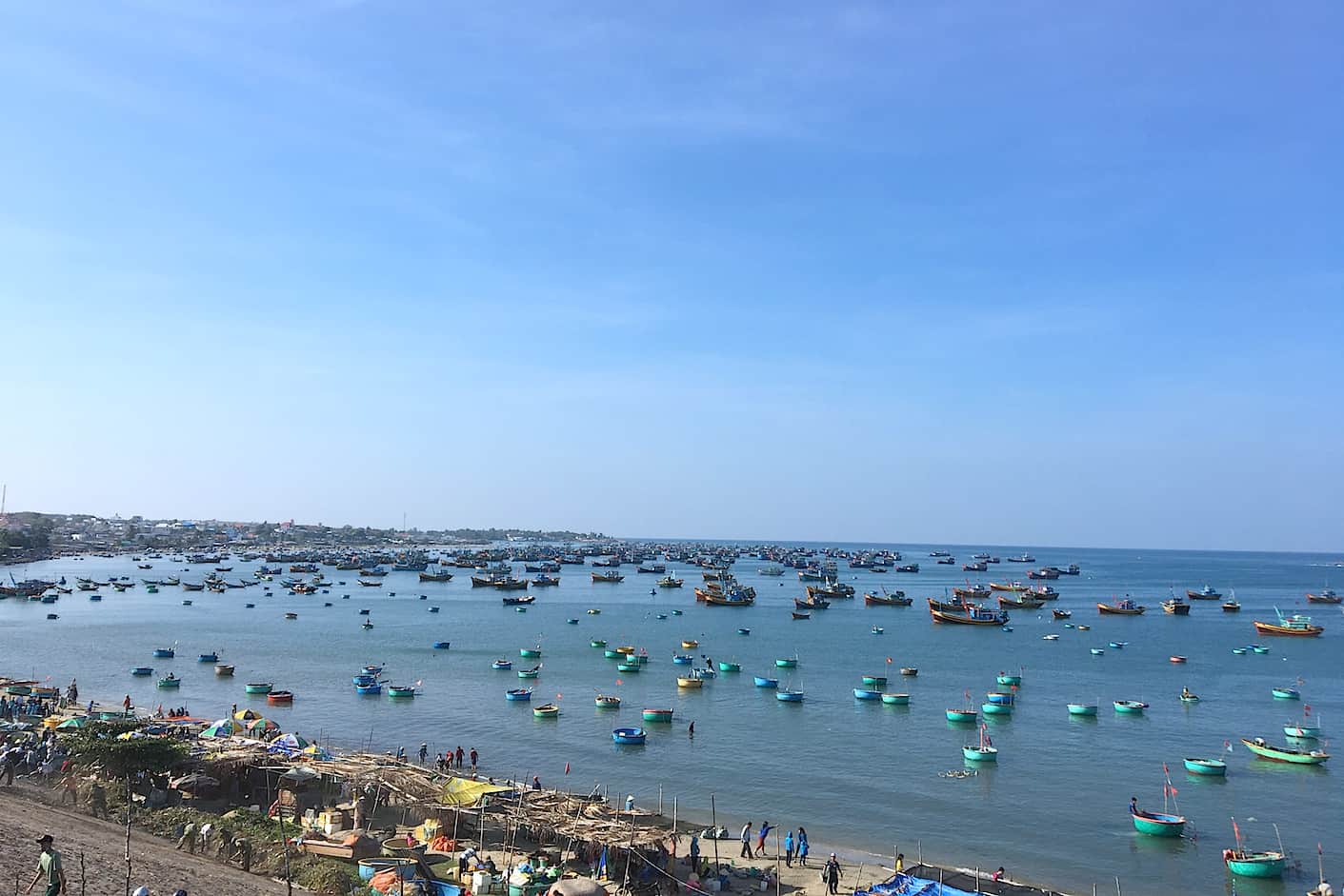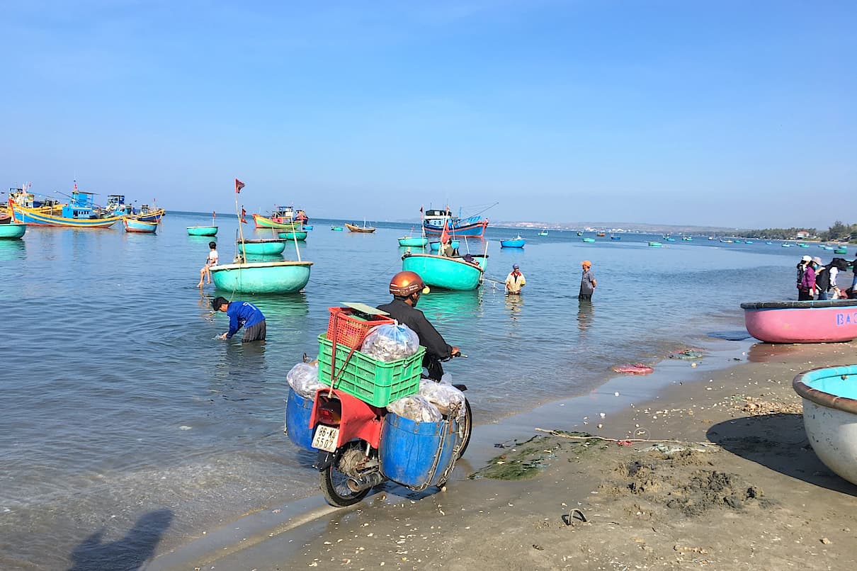 Een van de dingen die ik ook heel cool vond om te zien, was het visserdorpje in Mui Né. Voor de kust zie je daar wel honderden visserbootjes liggen. Deze zijn volgens traditie rond en altijd gekleurd. Ook was dat de plek waar de lokale bevolking daar hun vis kwam halen. Ze vertrokken daar met hun scootertjes volbepakt!