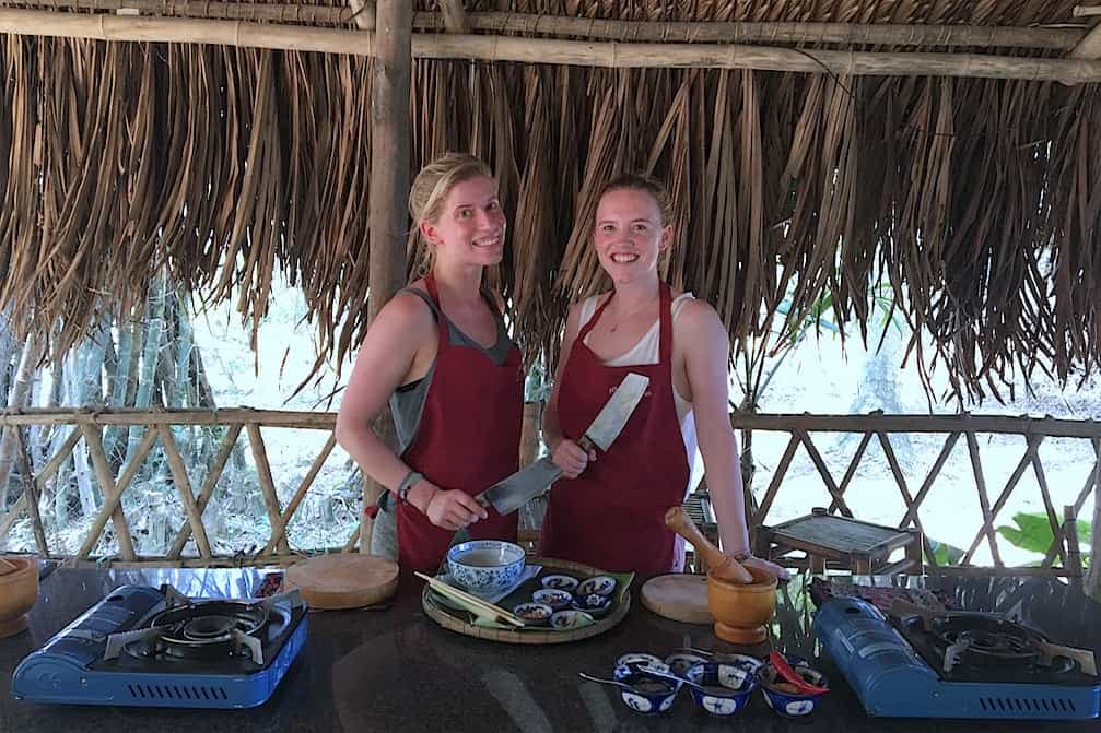 Van anderen hoorden we vooraf dat je bij cookingclasses vaak maar weinig maakt of niet zelf maakt, dat was bij ons zeker niet het geval want iedereen maakte zijn eigen vier recepten en alsof dat nog niet genoeg was kregen we daarna aan tafel nog een pompoensoepje en zwarte sesamvla (die laatste vond ik heel vies maar die pompoensoep was super). Hierna vertrokken we met volle buiken weer met de boot naar de stad, kregen we een boekje met alle recepten en ons laatst gekookte recept mee. Al bij al een hele gave ervaring die ik zeker iedereen zou aanraden wanneer je in Hoi An komt! Voor 37,50 dollar heb je echt een hele leuke dag en leer (en eet) je veel.