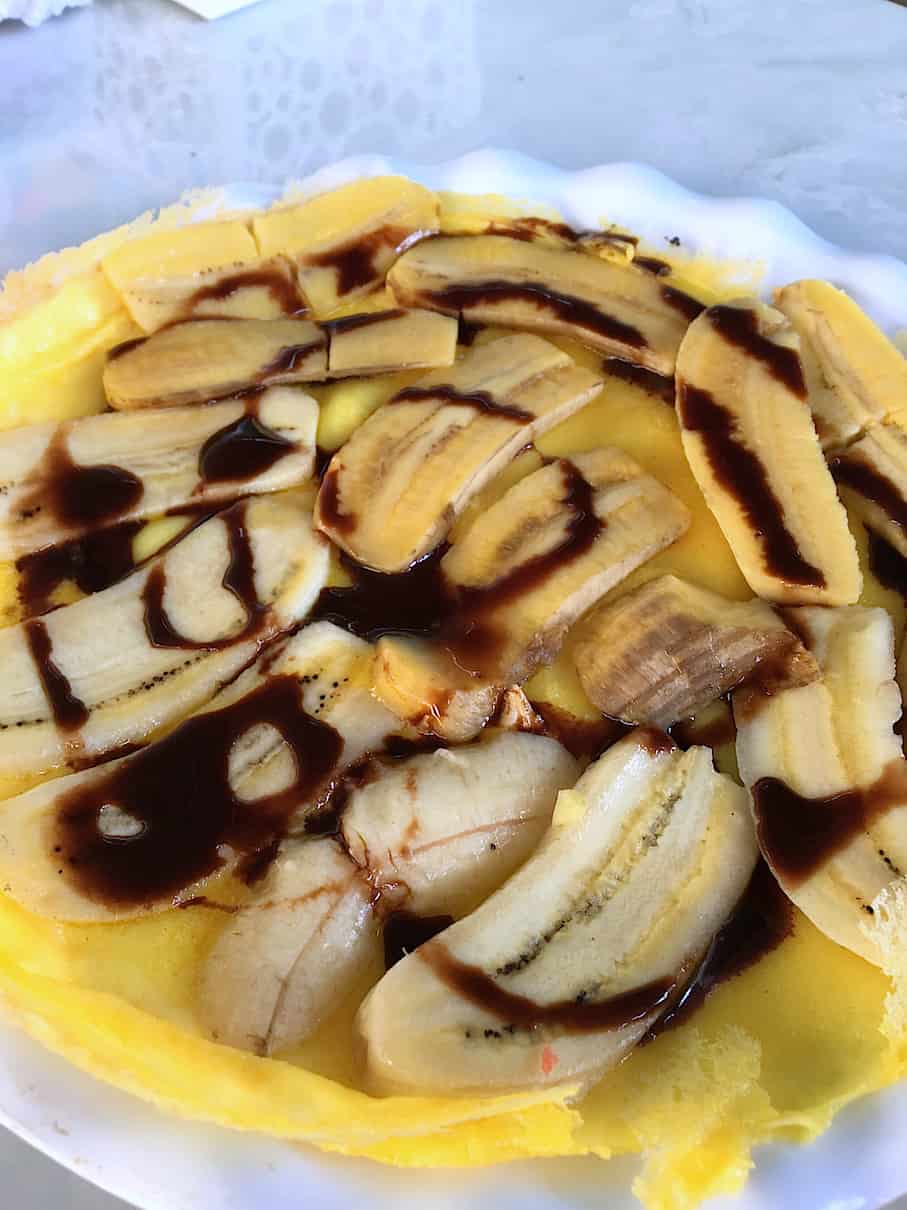 Naast Bahn Mi en vers fruit was er nog iets wat we heel graag als ontbijt namen en dat waren pannenkoeken. Vooral die met banaan was favoriet en als we er echt zin in hadden met wat chocoladesaus eroverheen.