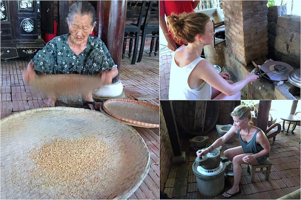 Eerst kregen we nog een uitleg over hoe op authentieke wijze rijstmelk gemaakt werd en daar vervolgens rijstvellen van. Dat mochten we zelf ook meteen proberen en oma deed het ook nog even voor! Dat alleen al was heel leuk.