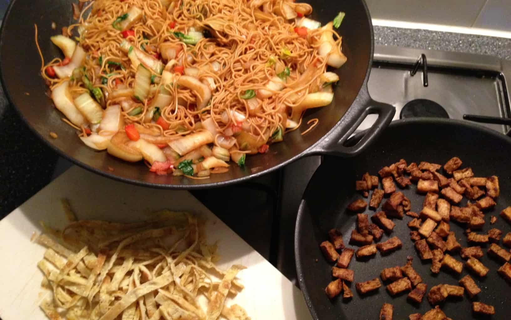 Verhit opnieuw een kwart van de zonnebloemolie en bak de tofu stukjes zeker 12 minuten in dezelfde pan totdat ze lekker krokant zijn. Zet op een gegeven moment het vuur zacht als het te snel gaat. Want tofu heeft de tijd nodig om krokant te worden.