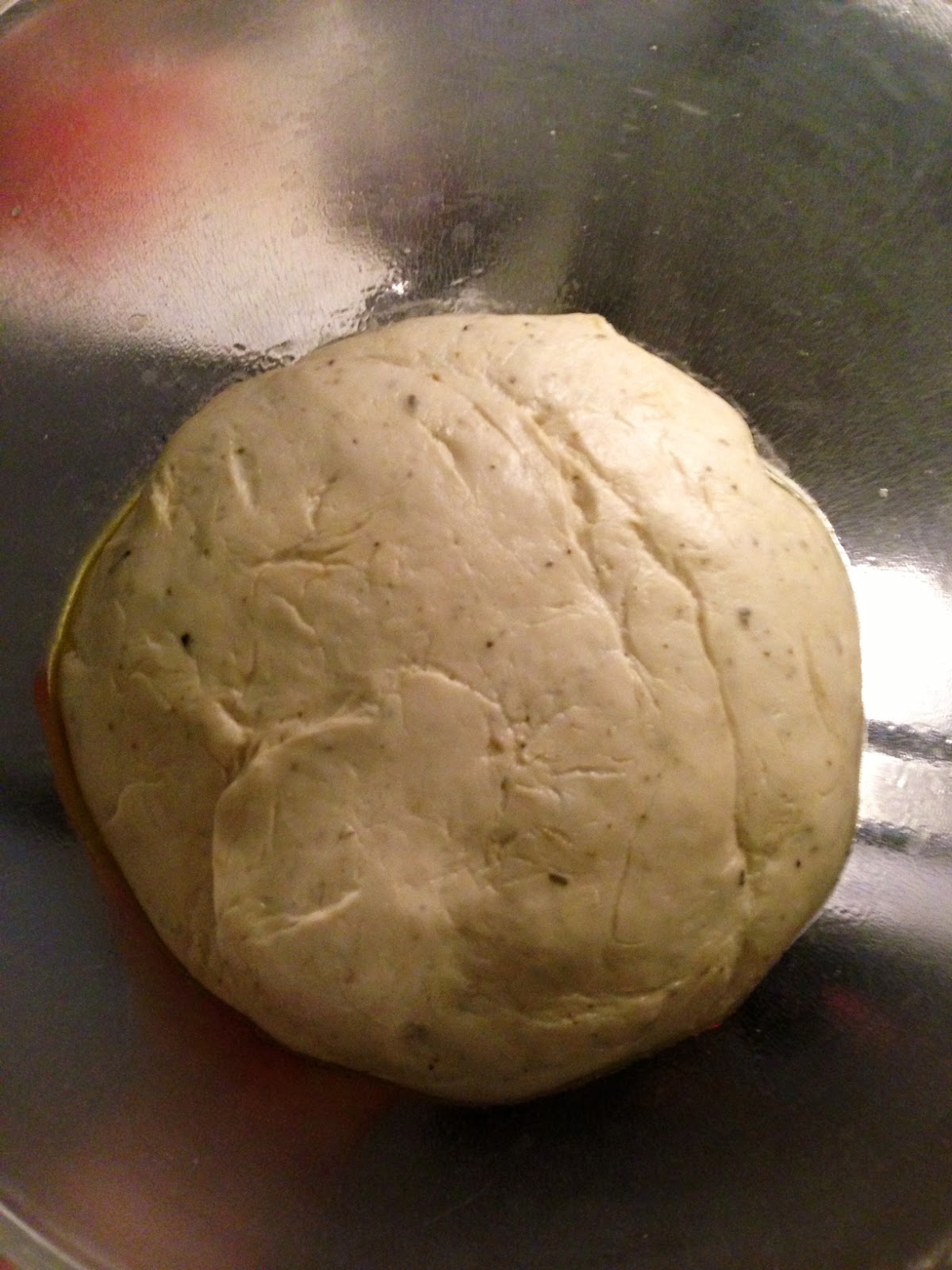 Meng de gist, oregano en zout door de tarwebloem en voeg daarna het water toe. Kneed met de hand tot een soepel deeg. In eerste instantie plakt het een beetje, maar dat gaat later weg. Blijf zeker een minuut of 5 doorkneden. Maak er daarna een bal van. Vet een grote kom in met een dun laagje olijfolie en smeer de bal ook heel lichtjes in. Leg de bal in de kom en dek af met huishoudfolie. Laat dit een uurtje staan op het aanrecht totdat de bal in volume verdubbeld is.