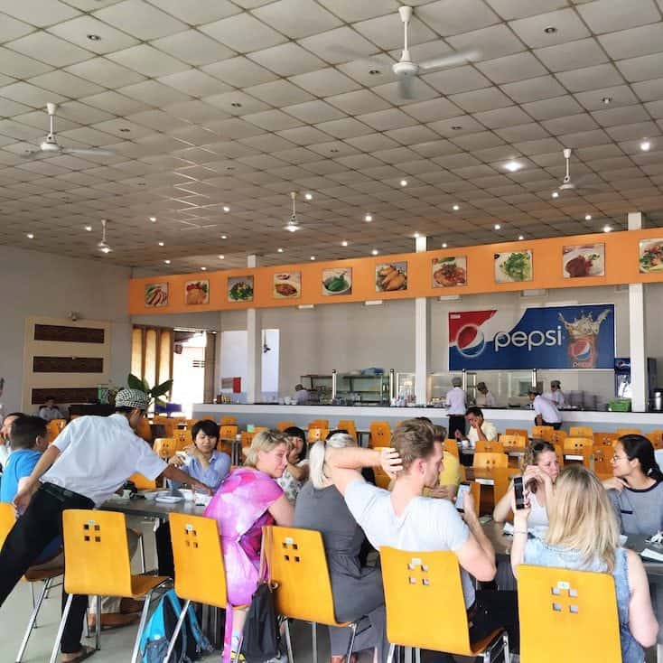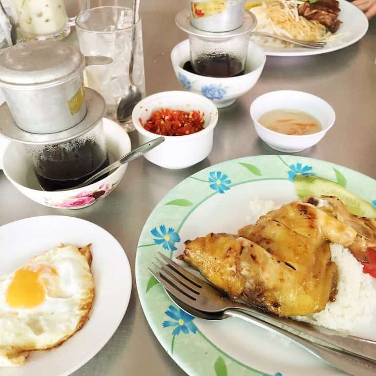 We maken een tussenstop onderweg om te ontbijten. Op tafel verschijnt rijst met keuze uit kip of geroosterd varkensvlees, groenten, chili en Vietnamese koffie.