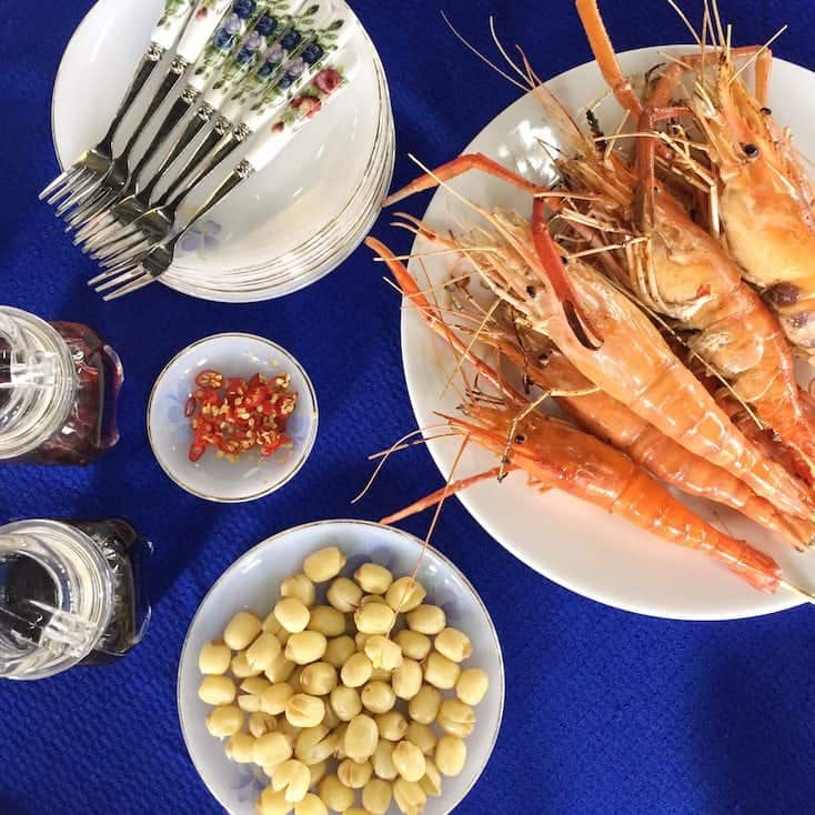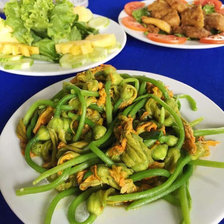 De gastvrijheid van Vinh Hoan houdt maar niet op, want we worden getrakteerd op een uitgebreide lunch met traditionele Vietnamese recepten. Ik eet voor het eerst van mijn leven echt verse panga. Het is een soort sticky fried panga waarvan ik het recept nog even moet ontfutselen, want de marinade was hemels lekker. Wel proef ik gelijk dat de panga veel aardser smaakt dan wat ik gewend ben. Ook worden we getrakteerd op onder andere grote garnalen en pompoenbloemen.