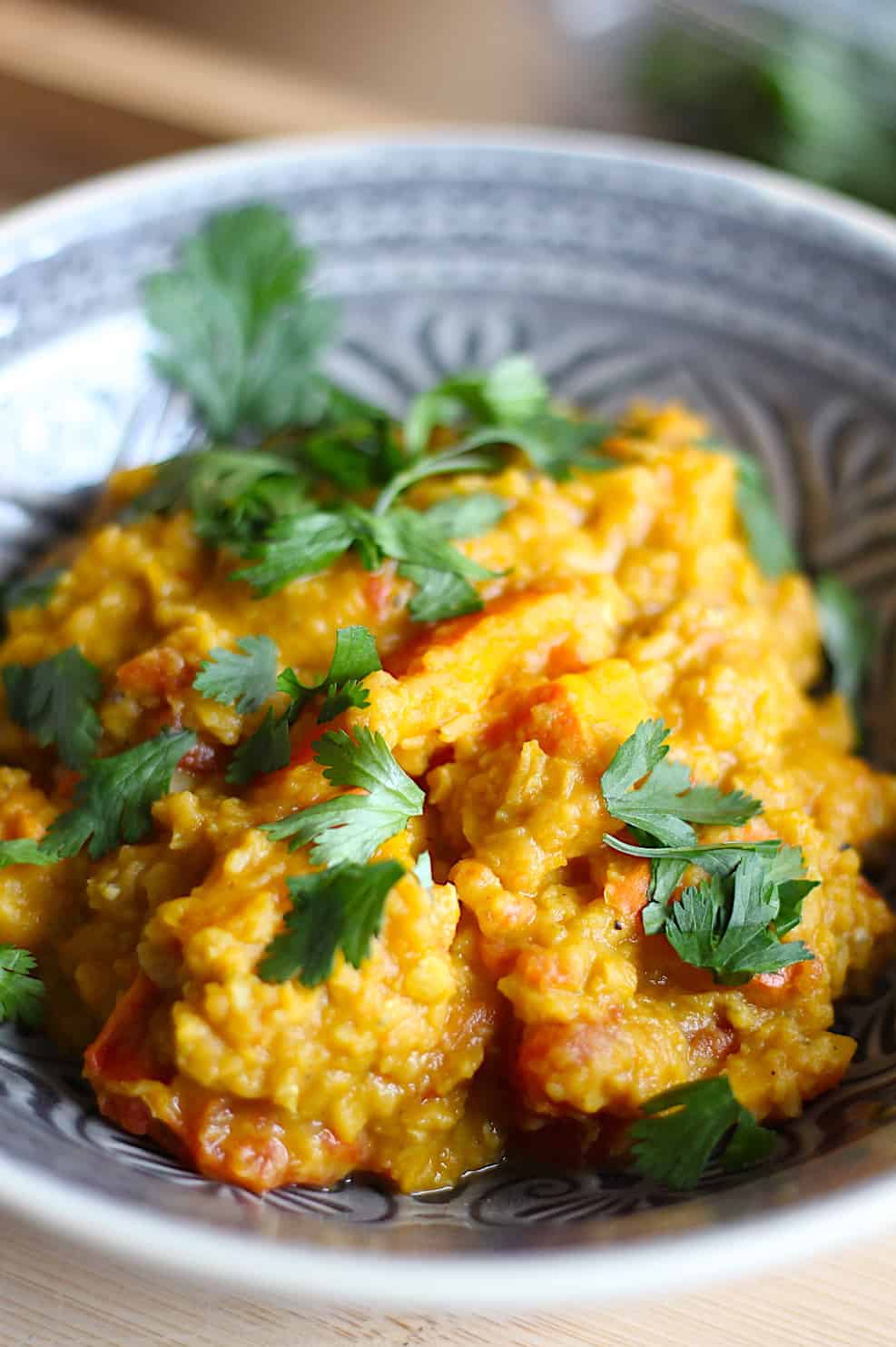 Tot die tijd heb ik voor jullie het heerlijke (ja echt, niet luisteren naar die Surinaamse mopperdoos van me) recept van deze dahl met pompoen uitgewerkt. Normaal zit er vaak spinazie doorheen, maar ik wilde een herfstig tintje aan het gerecht geven en dat werd pompoen.